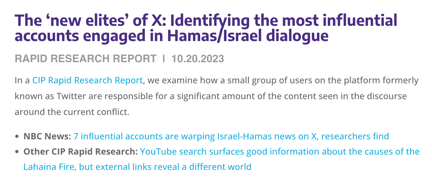 Their mission “is to resist strategic misinformation, promote an informed society, and strengthen democratic discourse”.AS of this month (Nov 2023), the CIP has now turned its identification of targets for censorship to identifying the flow of what they view as the “new elites” of X (ergo influencers with large followings) regarding how they share information regarding the Hamas/Israel conflict.