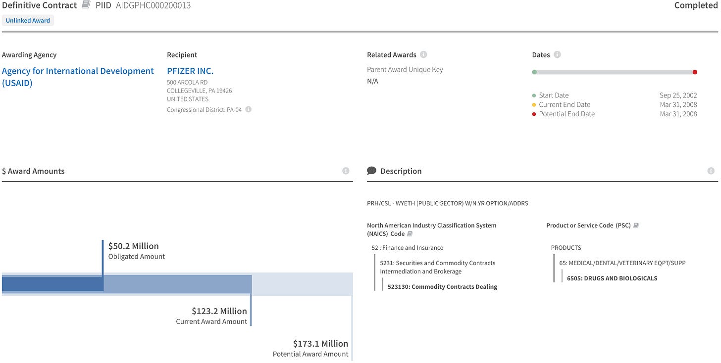 In researching USAID funding history relating to COVID, searching on the Federal USA Spending web portal revealed that USAID has awarded up to 6.9 Billion US Dollars to Pfizer for “COVID-19 VACCINES FOR INTERNATIONAL DONATION” as of July 20, 2021 (contract W58P0521C0002). Of those 6.9 B$, 2.8B$ are reported to have been spent.