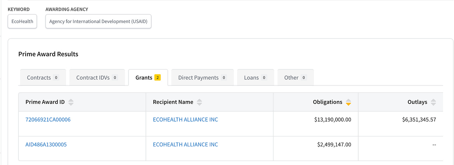 In addition to apparently funding academic “misinformation” research, USAID has also been used as a funding conduit for various “public health”- related endeavors. This mechanism appears to be used to bypass HHS oversight for various biological research and health-related programs. For example, in 2021, the Daily Mail reported that USAID funded Peter Daszak's EcoHealth Alliance to the tune of $64.7 million. Apparently only a fraction of this funding is being reported via the USA Spending website, the remainder apparently being “dark” or classified funding.