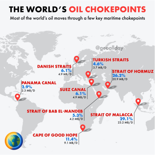 Chokepoints in shipping jargon specifically mean narrow channels along widely-used global sea routes that are critical to global energy security. Think of a chokepoint as one of your main arteries. If your femoral artery gets blocked, you develop health problems immediately, if not life-threatening.The inability of oil to transit a major chokepoint, even temporarily, can create substantial supply delays and raise shipping costs, potentially increasing world energy prices. Although most chokepoints can be circumvented by using other routes—often adding significantly to transit time and some chokepoints have no practical alternatives.