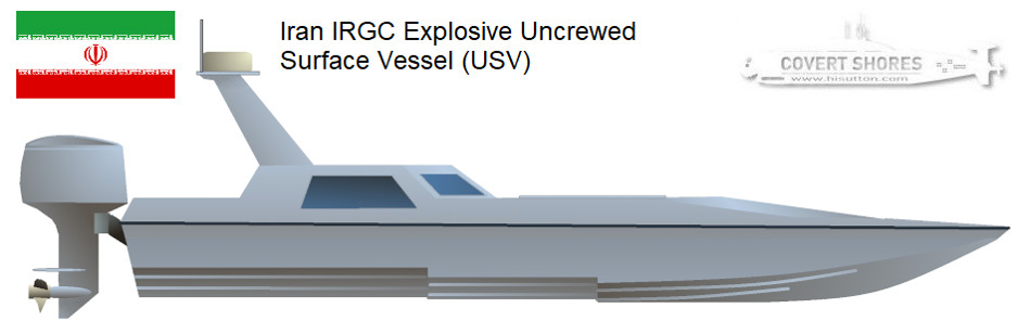 The IRGC, as opposed to the conventional Iranian Naval Forces, has been using explosive-laden uncrewed surface vessels (USVs) — often called “kamikaze” or “suicide” drone boats — in attacks on commercial shipping. These are small, high-speed speedboats modified to carry hundreds of kg of explosives, remotely controlled (or GPS-guided), and designed to ram and detonate against targets like tankers.