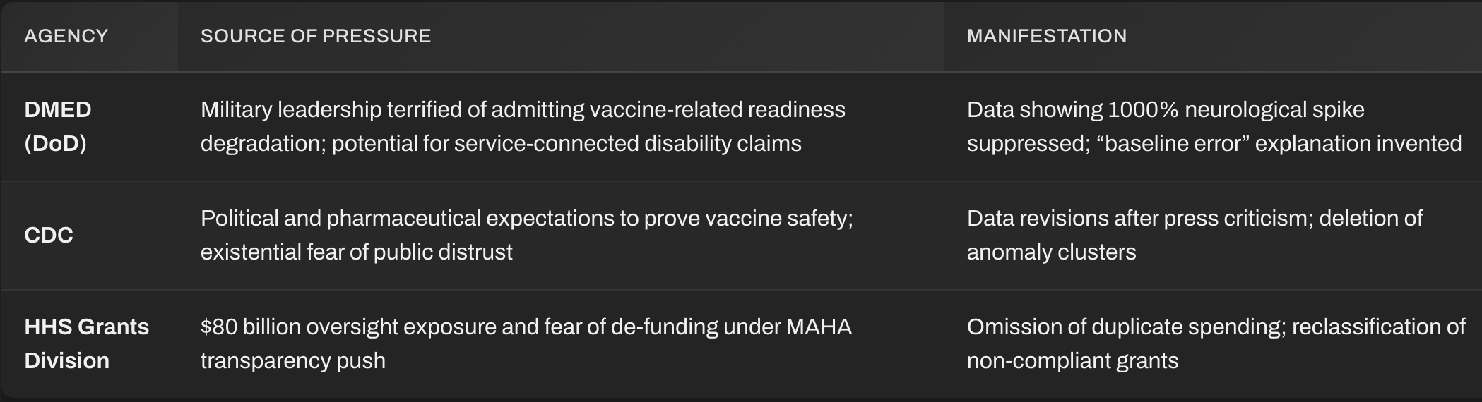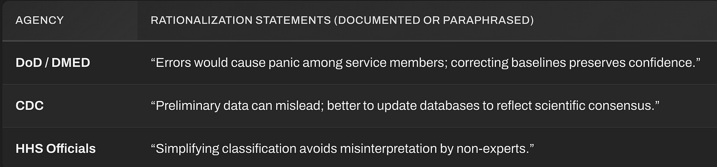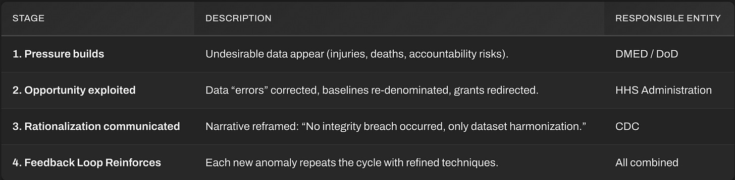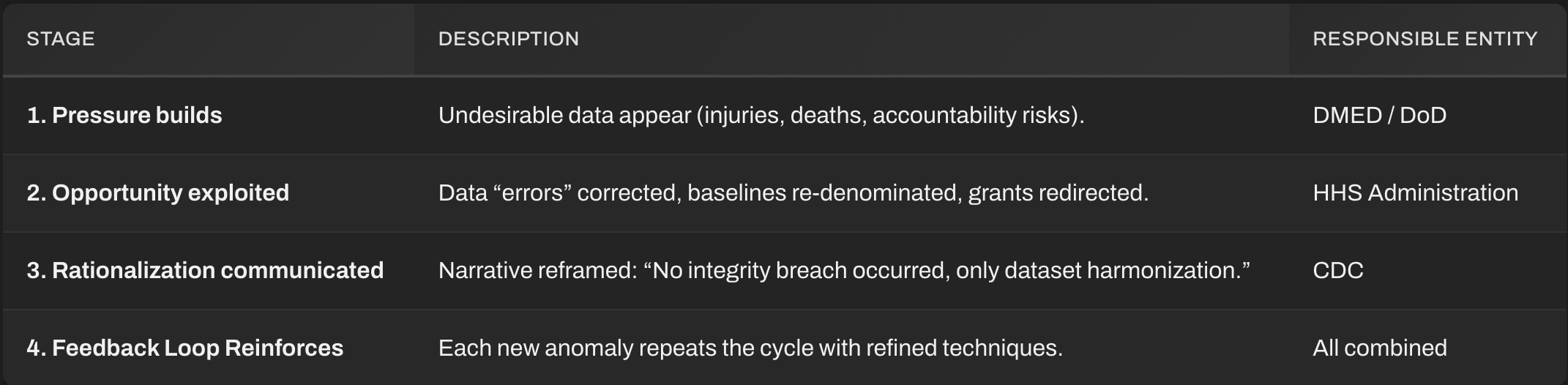 The DMED revelations and the subsequent CDC disclosures are not mere isolated incidents of error, but a unified system of institutional deception, one that places bureaucratic and institutional self‑preservation above truth. Together, these cases reveal a government‑wide mechanism designed to manufacture confidence rather than earn it. The pattern is unmistakable: when data threaten authority, the data are redefined; when truth endangers stability, stability is recast as manufactured truth.