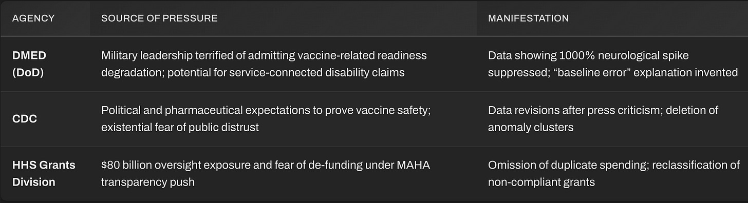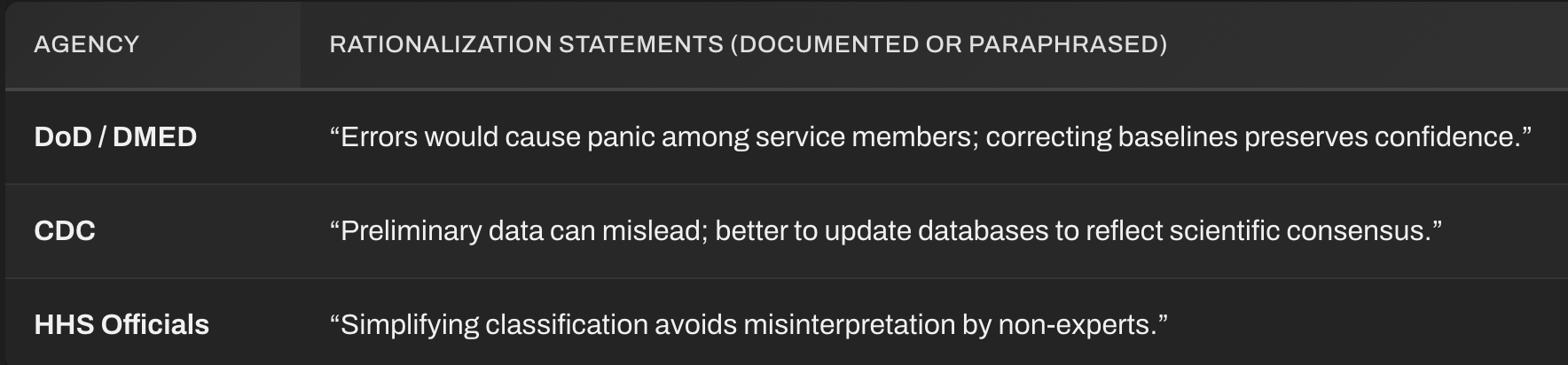 The military side faced existential pressure; any admission of mass injury would mean admitting combat unfitness and massive disability liabilities.The civilian/HHS/FDA/CDC side experienced both internal and external pressure to maintain the “safe and effective” narrative, under the justification that any data contradicting it would increase vaccine hesitancy and thereby cause avoidable deaths.