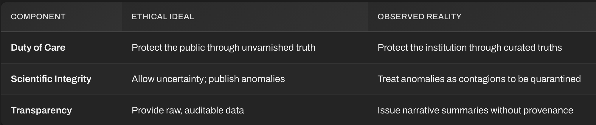 When watchdogs asked for raw data, agencies produced filtered derivatives, sanitized simulacra of truth. Third parties were prevented from independently auditing or reviewing data. Scientific journals were pressured and imposed narrative control, including the rejection of data that contradicted official narratives and reports.