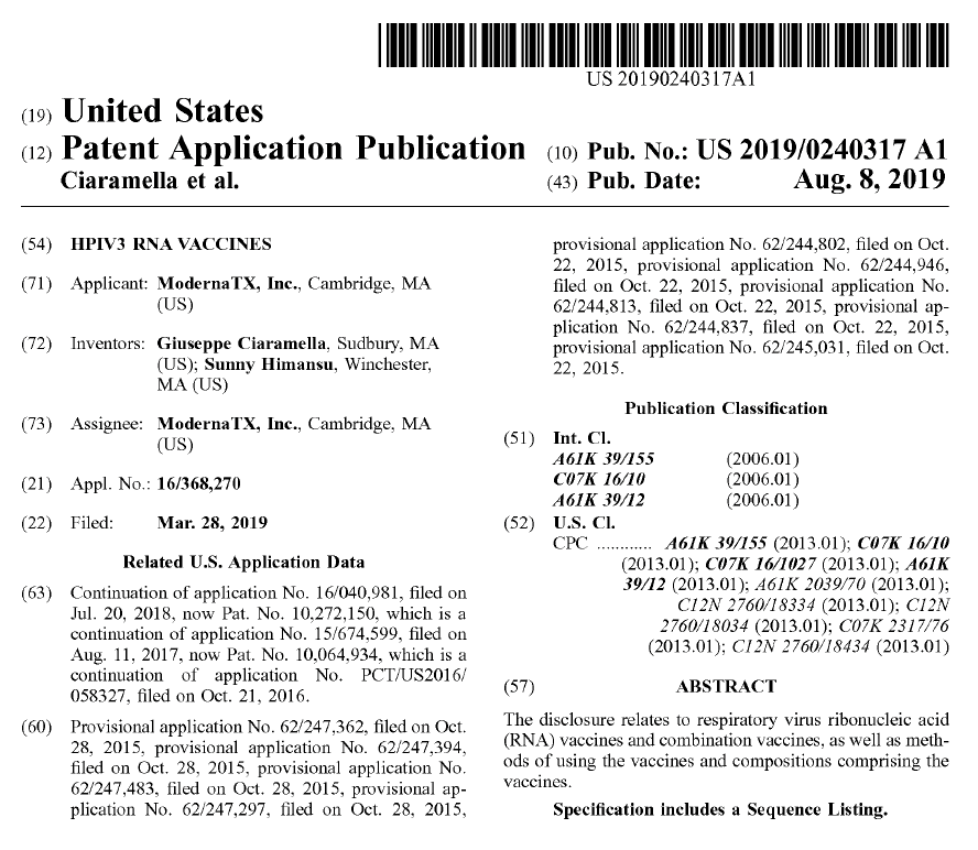 Unfortunately for the FDA, the modified mRNA manufacturer Moderna clearly acknowledges the risks of genotoxicity associated with delivered DNA. In the issued US Patent #US2019/0240317 A1 (see image above) titled “HPIV3 Vaccines”, Moderna provides the following text: