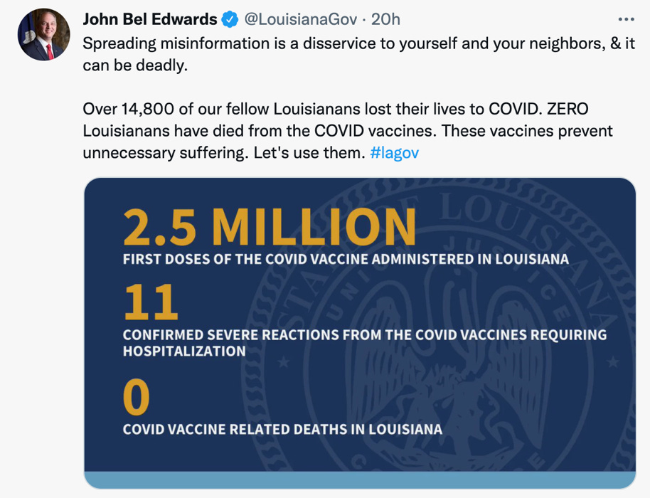 Predictably, the legacy media covered the rout of Governor Edwards’ attempt at a bureaucratic end run for mandating that the children of Louisiana be subjected to an unlicensed, experimental medical product by misrepresenting the testimony provided, gaslighting and attempting to delegitimize those providing testimony while regurgitating the vaccine mis- and disinformation provided by the Governor’s representative Louisiana Public Health Officer Dr. Joe Kanter, who believes that COVID-19 represents a significant health threat to children, denies that the vaccines are experimental, and rejects the idea that an unlicensed vaccine shouldn’t be added to the immunization schedule just because it doesn’t keep someone from getting infected or spreading the virus to others. Unfortunately, none of these opinions are consistent with an objective fact-based assessment or past precedent, and Dr. Kanter did not provide any actual data to support these opinions- other than that no vaccine-associated deaths have been reported to his office via the unpublicized telephone number provided by his office to report any such events (which assertion was then posted to social media by the Governor himself as shown below).