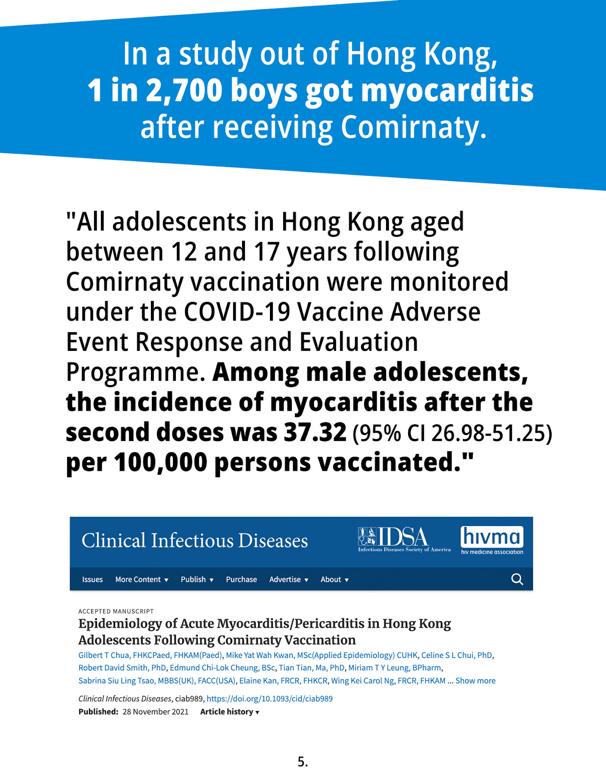 Readers will recognize a typical pattern of derisive legacy media coverage of data and opinion which is not consistent with the approved narrative that the Pfizer COVID-19 vaccine is safe and effective in children, including the notable absence of media coverage of the recent peer-reviewed publication from Hong Kong documenting that 1 in 2,680 young men develop clinically significant acute myocarditis/pericarditis following Comirnaty vaccination.