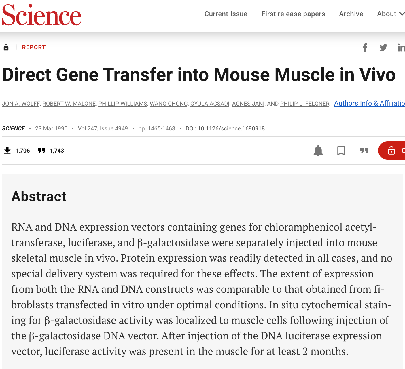 <RWM: Here is where this just interview veers into the childish and absurd. The process here is called DNA transfection. DNA transfection is a routine practice in virtually every molecular and cellular biology (and molecular virology) laboratory in the world. Here is a paper, which Offit purports to be familiar with, which shows that you can get DNA into the nuclei of post-mitotic cells - ergo not dividing - and it will make mRNA and protein. Muscle cells. Even without cationic lipid nanoplexes. It has tens of thousands of citations. It was published in Science in 1990. I was the second author. I am flabbergasted. Is Paul Offit really this ignorant? It is hard to imagine that this person has been trusted to provide FDA or CDC advice on these mod-mRNA products.>