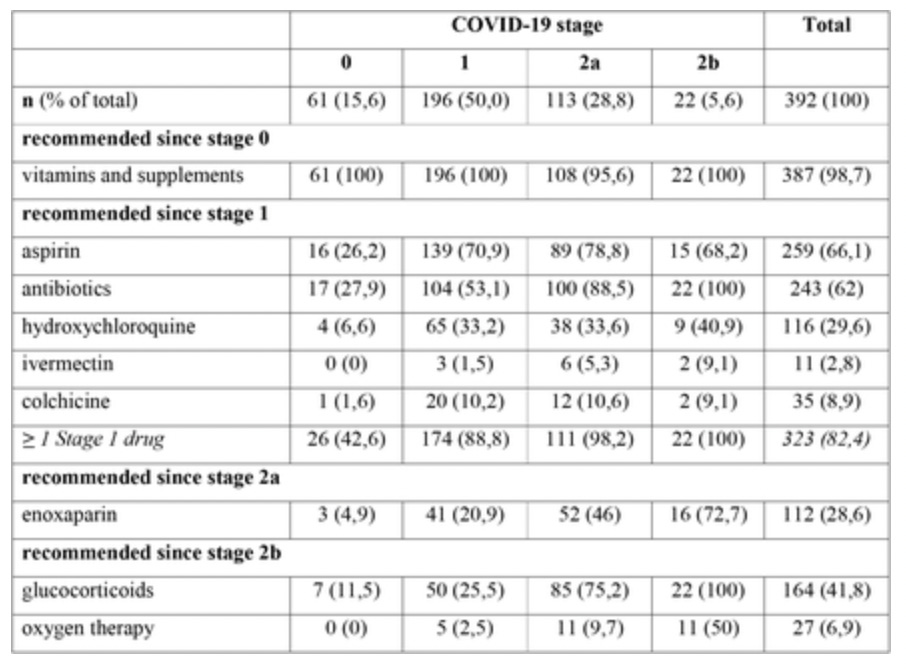 The protocol used for this study is more typical of the protocols used in the United States. As is often the case in the United States, the general treatment protocol developed by the Ippocrateorg team is staged by disease severity, and can be found here.