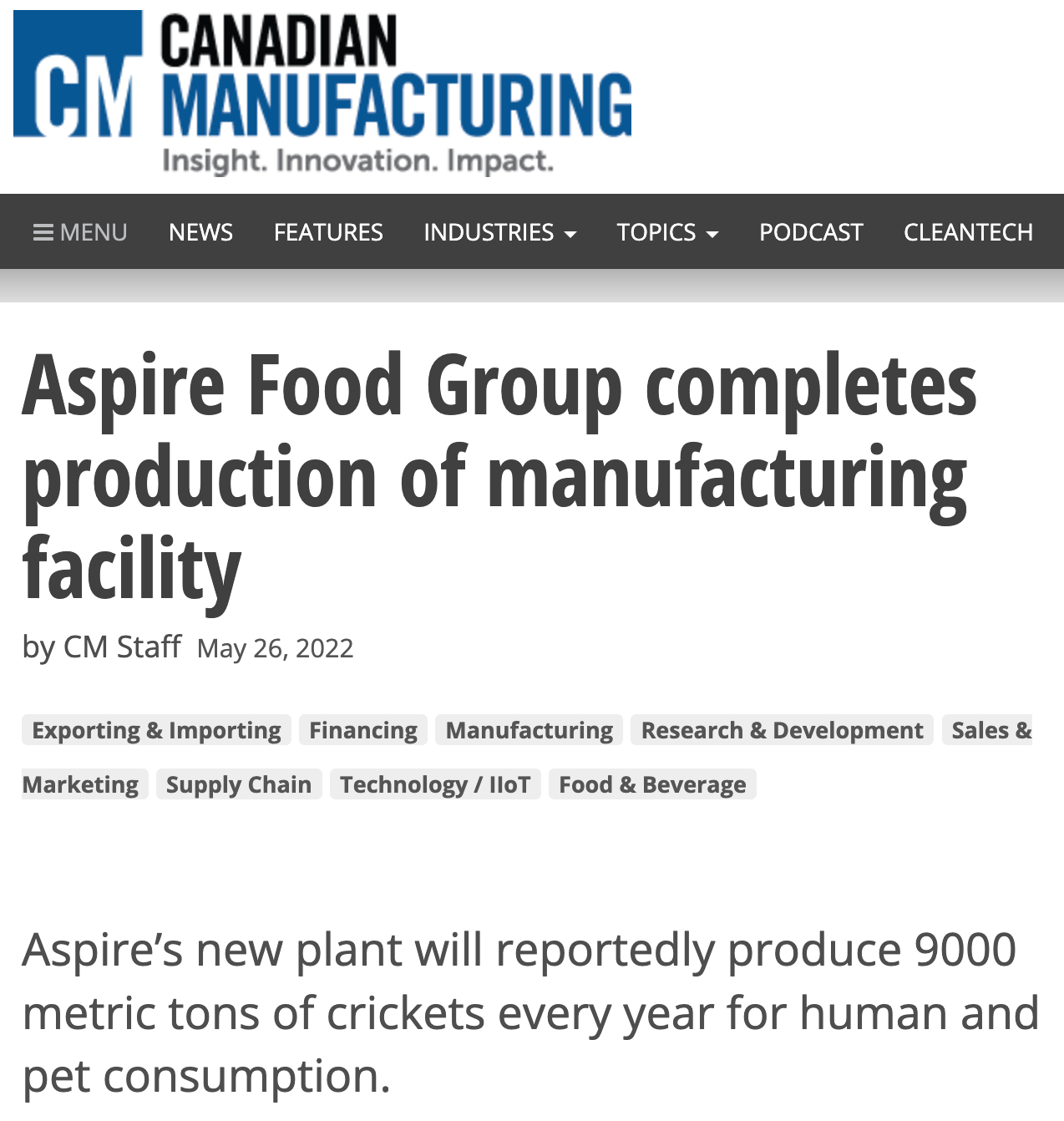 Just take a gander at the “Aspire Group” and their new “manufacturing plant” for crickets. Yep - that it what it is being labelled as… by the Canadian Manufacturing trade group.