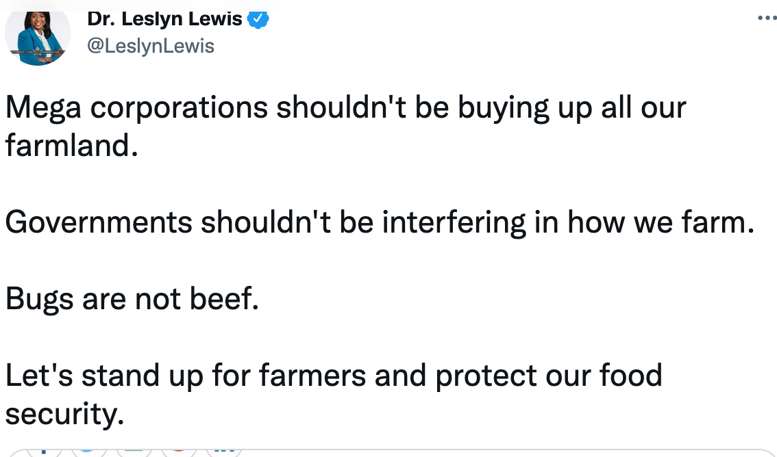Conservative Party of Canada MP and leadership candidate Dr. Leslyn Lewis blasted the current cancel-culture crusade against red meat through pushing bugs as a source of food with this tweet.