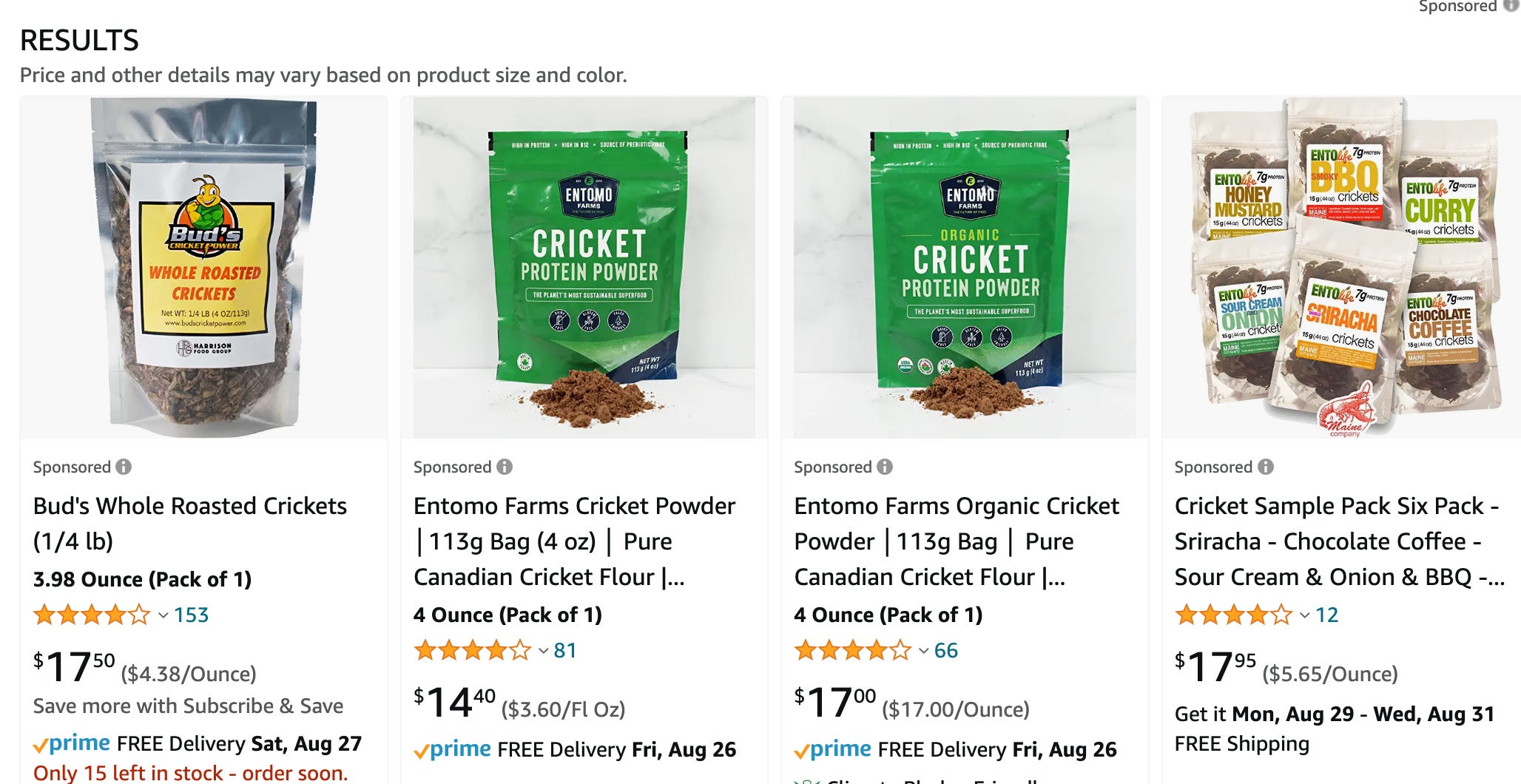 Cricket products sold at Amazon (a Walmart search yielded the same types of food items).