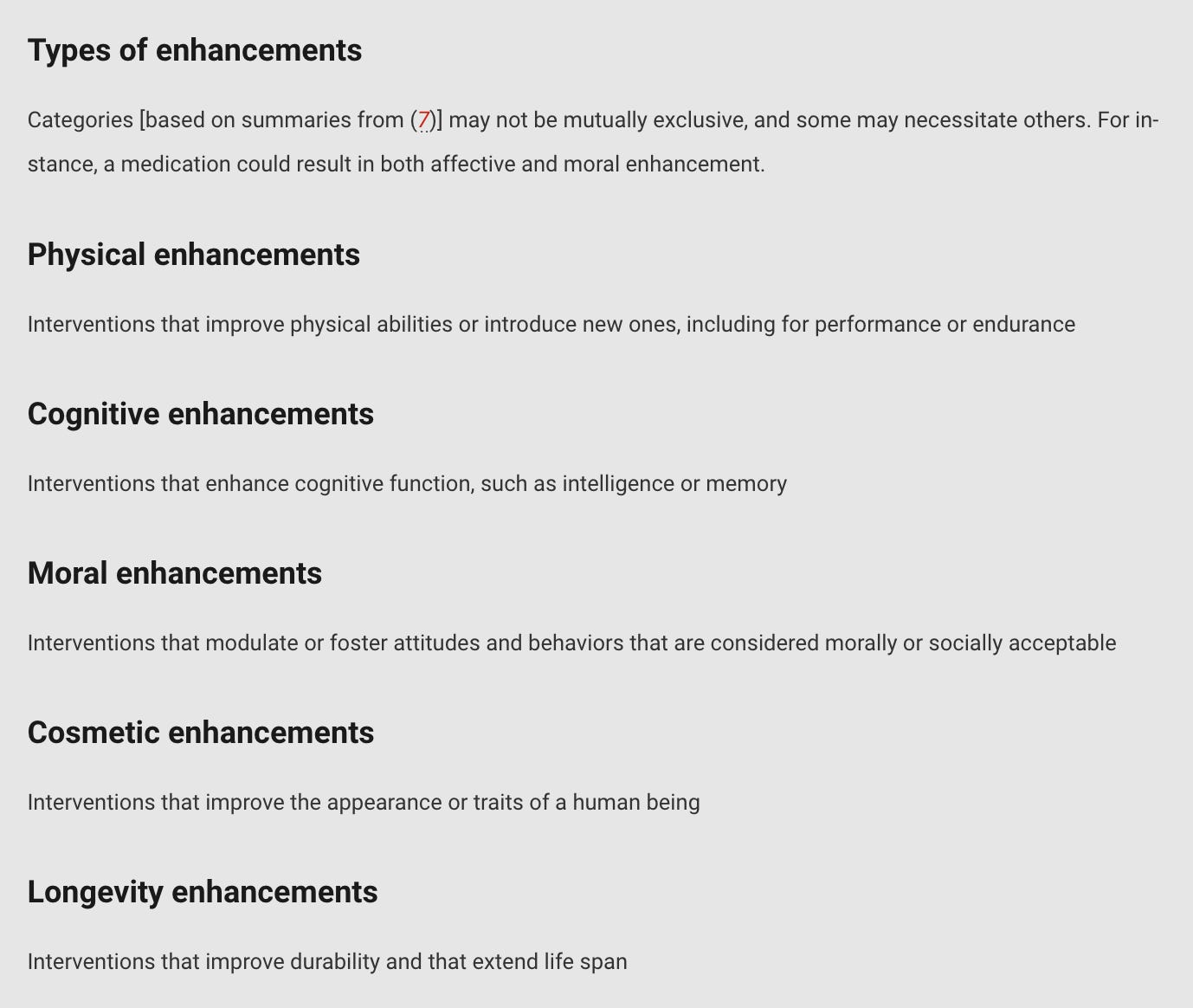 Then there are the enhancements involving somatic (altering the genetic code in a group of cells) and germ-line (permanently altering the genetic code for generations) gene editing.