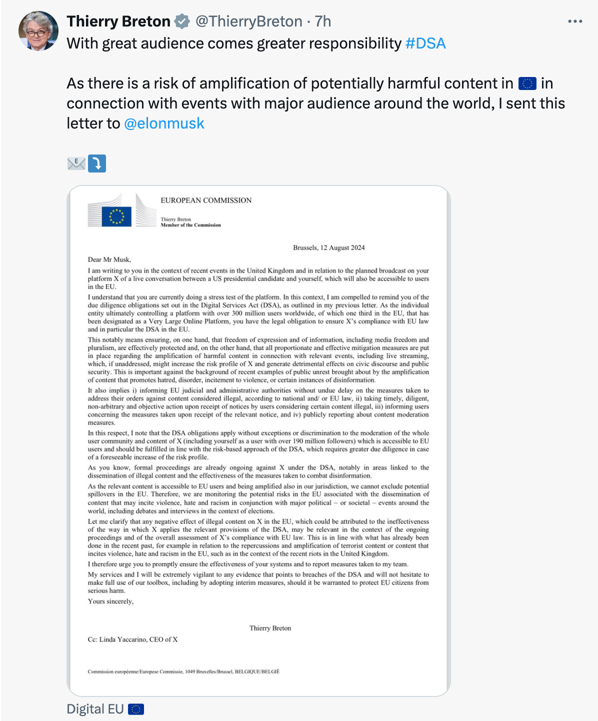 This seems to have triggered Thierry Breton into taking another direct online attack on Musk and “X.” Breton posted a vaguely threatening but unsigned letter on “X,” apparently (specifically tagging Musk) seeking to interfere in the US Election. Carbon copy to X CEO Linda Yaccarino.