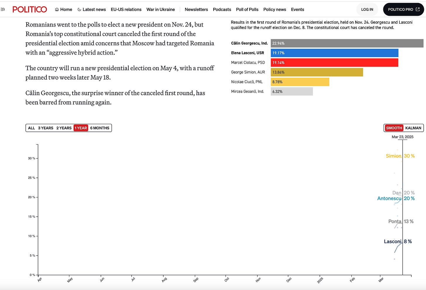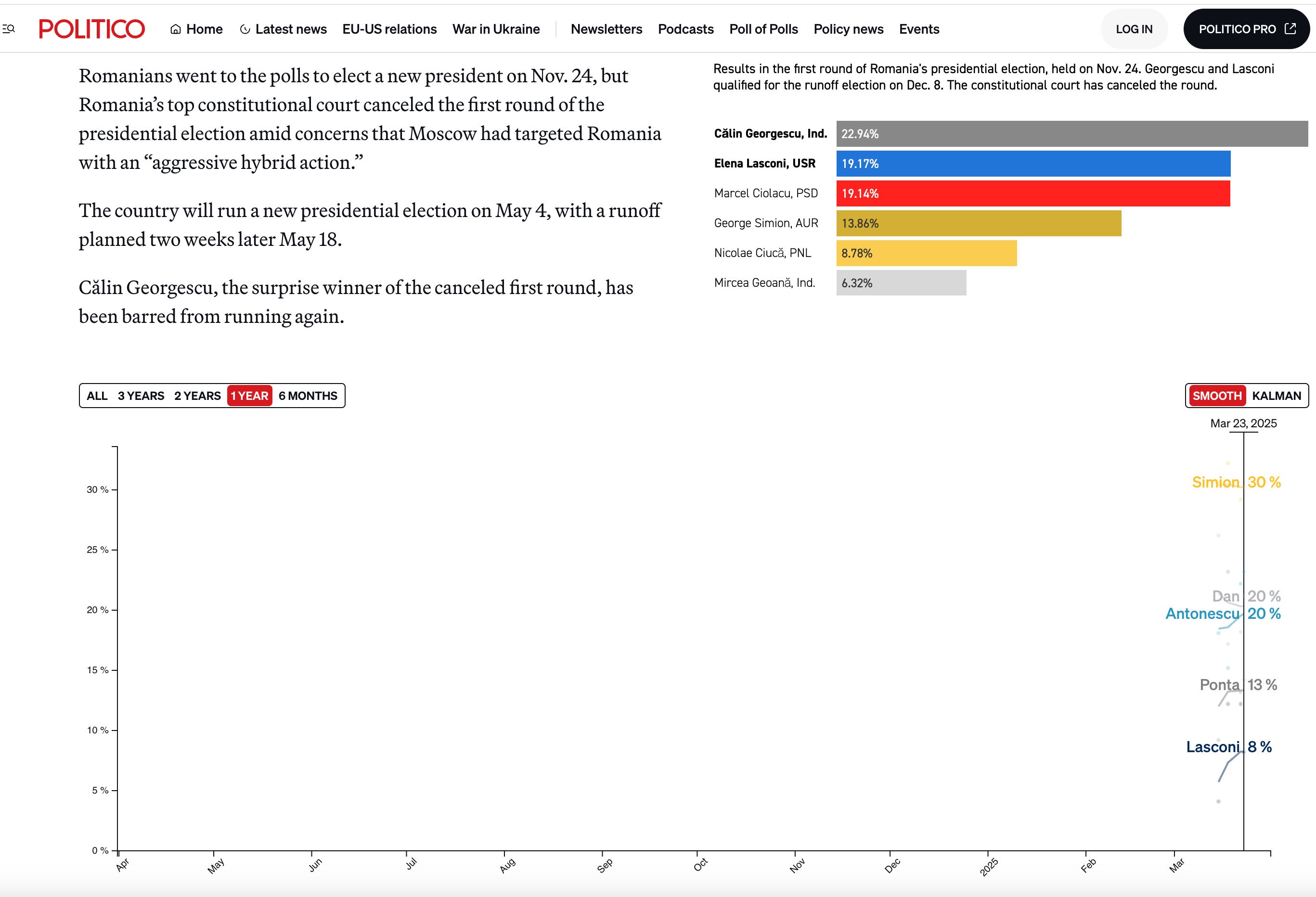 The graphic above shows that Georgescu received 22% of the vote in the fall election and Simion received 13% of the vote. For a total of 35% of the vote total. In a poll conducted in March 2025, Simion has picked up most of Georgescu’s support and is polling at 30%, putting him well in the lead for the May 4 presidential election.