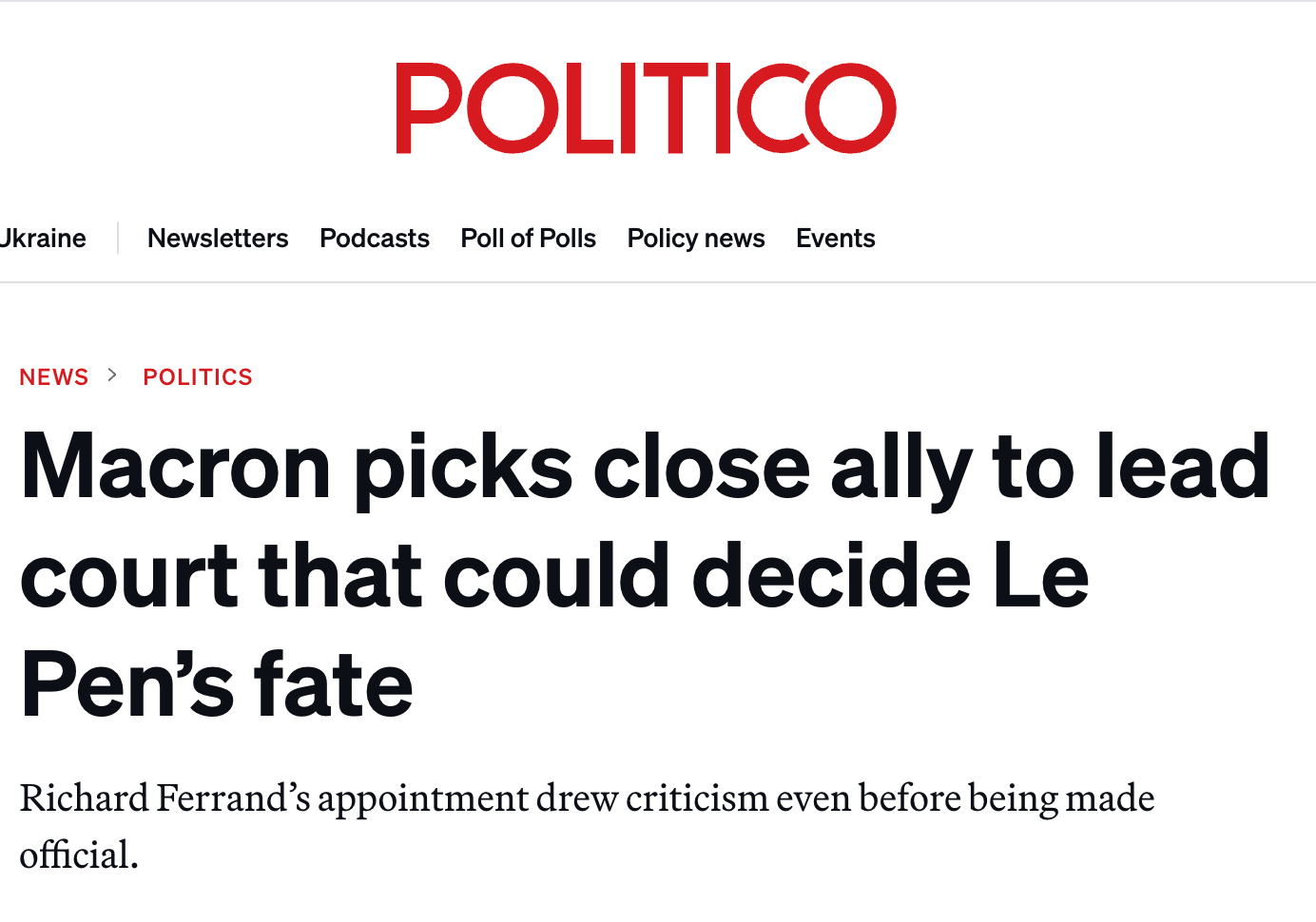 Macron is evil - he arranged for this court verdict by choosing a close ally as the judge of Le Pen’s court case. Marine Le Pen, who heads the National Rally (RN) party was convicted of embezzlement and barred from running for public office for five years, sentenced to four years in prison, with two years suspended and two under house arrest, and was fined €100,000 ($108,000).
