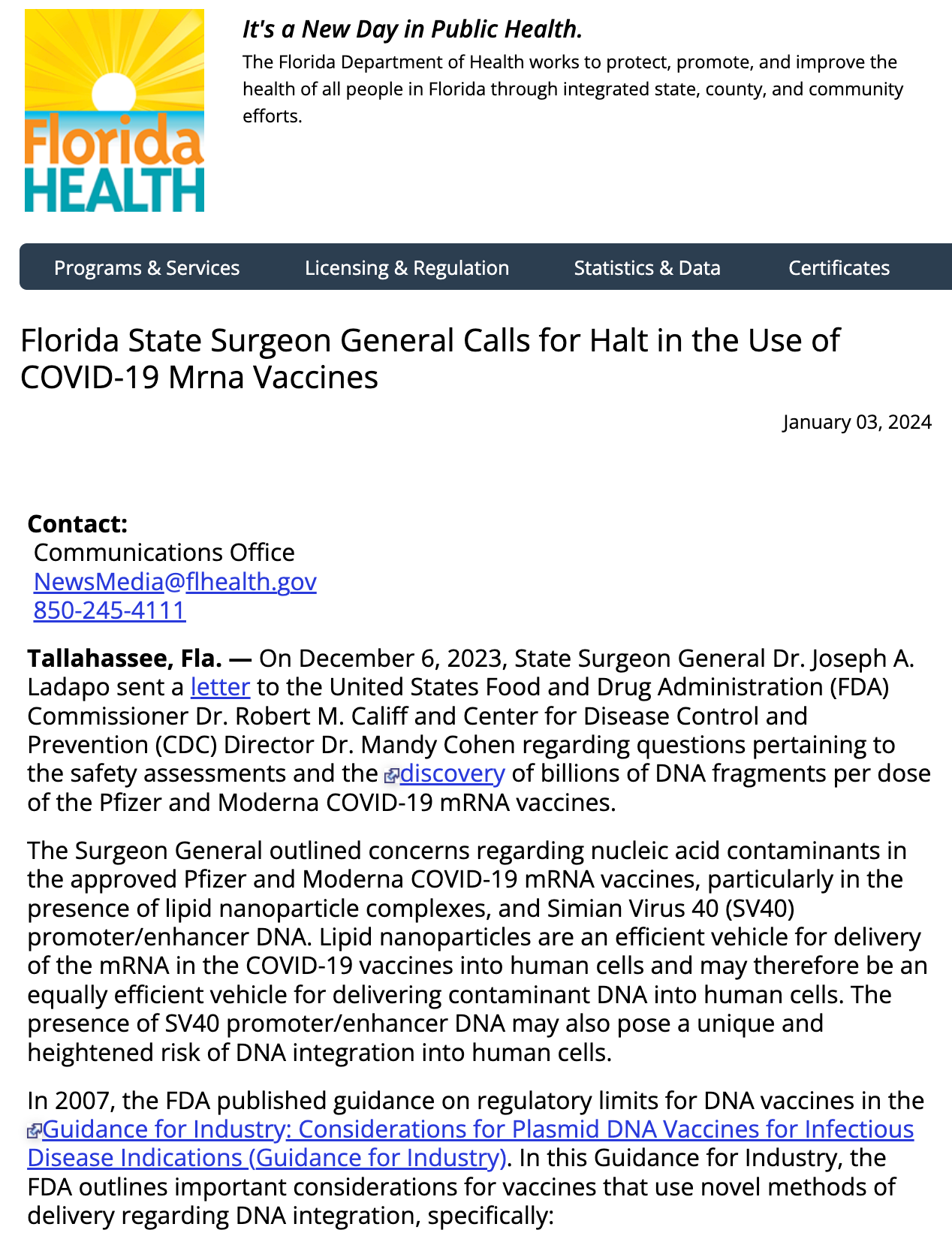 This statement can be found on the Florida Dept. of Health website, dated Wednesday - January 3, 2024.