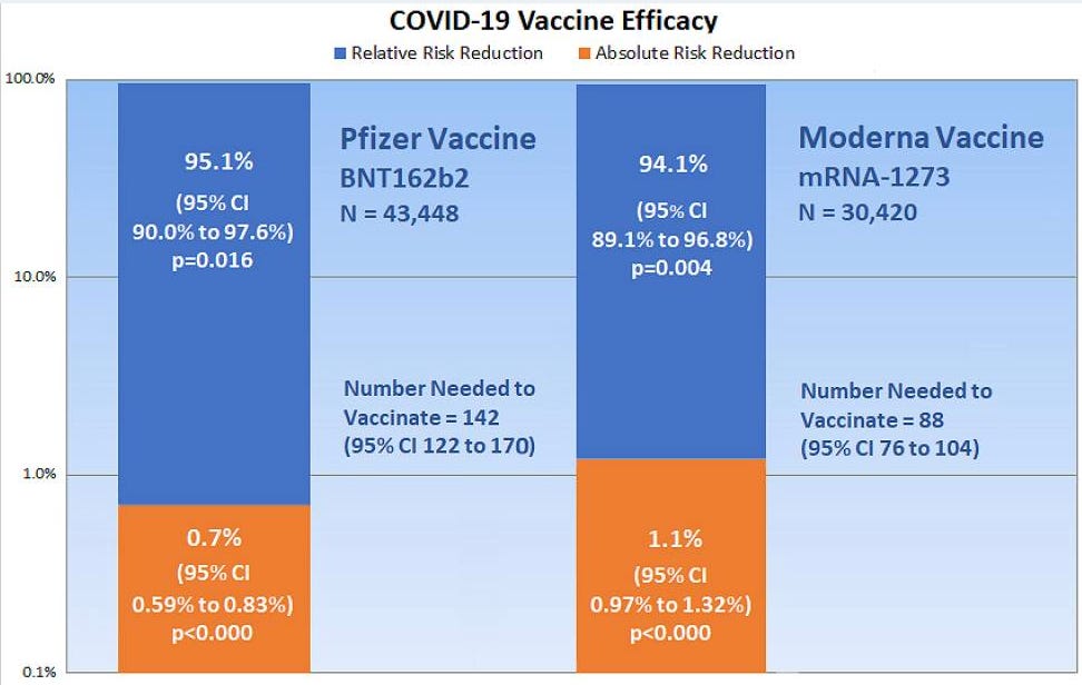 Relative risk reduction and absolute risk reduction measures in the evaluation of clinical trial data are poorly understood by health professionals and the public. The absence of reported absolute risk reduction in COVID-19 vaccine clinical trials can lead to outcome reporting bias that affects the interpretation of vaccine efficacy. The present article uses clinical epidemiologic tools to critically appraise reports of efficacy in Pfzier/BioNTech and Moderna COVID-19 mRNA vaccine clinical trials. Based on data reported by the manufacturer for Pfzier/BioNTech vaccine BNT162b2, this critical appraisal shows: relative risk reduction, 95.1%; 95% CI, 90.0% to 97.6%; p = 0.016; absolute risk reduction, 0.7%; 95% CI, 0.59% to 0.83%; p < 0.000. For the Moderna vaccine mRNA-1273, the appraisal shows: relative risk reduction, 94.1%; 95% CI, 89.1% to 96.8%; p = 0.004; absolute risk reduction, 1.1%; 95% CI, 0.97% to 1.32%; p < 0.000. Unreported absolute risk reduction measures of 0.7% and 1.1% for the Pfzier/BioNTech and Moderna vaccines, respectively, are very much lower than the reported relative risk reduction measures. Reporting absolute risk reduction measures is essential to prevent outcome reporting bias in evaluation of COVID-19 vaccine efficacy.