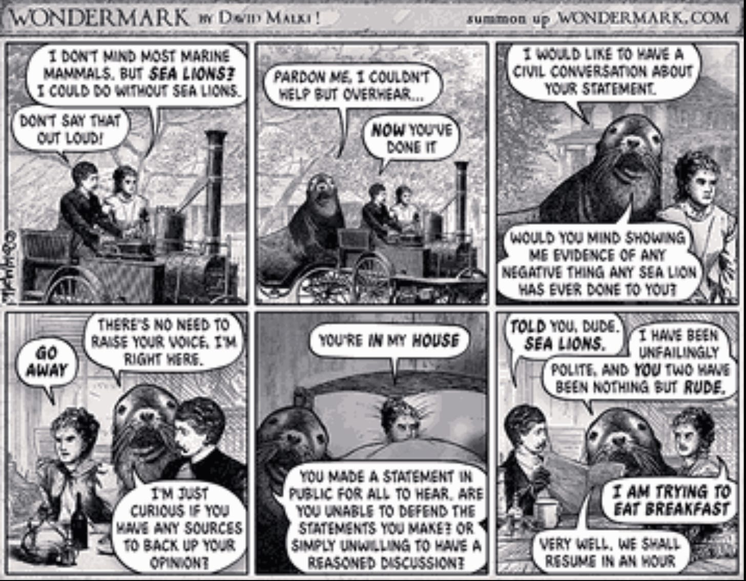Use of the term originates from a 19 September 2014 strip of the webcomic Wondermark by David Malki titled The Terrible Sea Lion, where a character expresses a dislike of sea lions and a sea lion intrudes to repeatedly ask her to explain her statement and attempts (in an exaggeratedly civil manner) to interrogate her views, following the characters into the privacy of their own home. "Sea lion" was quickly verbed, and noting this, Malki posted on his own Wondermark site, "I'm happy that it's resonated with so many people".