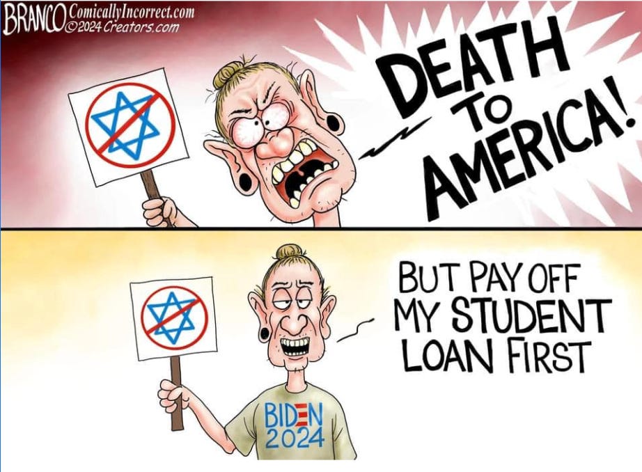When I hear all of the pampered Ivy League students chant death to the Jews and death to America, I wonder if they could be kind enough to put their mass murders on hold until after all of us have paid their student loans off in full?