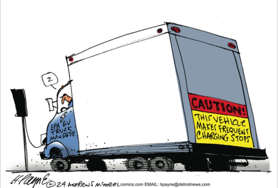 EVs make up less than 1% of U.S. heavy-duty truck sales, and nearly all are in California, which heavily subsidizes and mandates their purchase. EPA’s rule will require electric models to account for 60% of new urban delivery trucks and 25% of long-haul tractor sales by 2032 (WSJ).