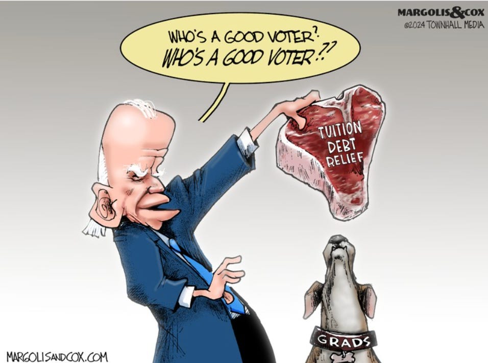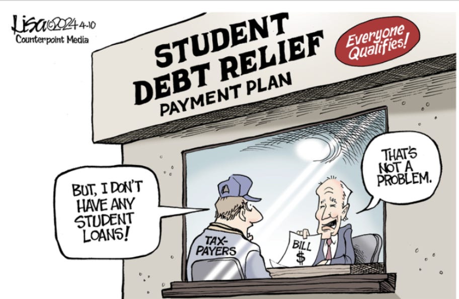 The Administration is essentially turning college into an open-ended, taxpayer-financed entitlement by canceling loans on the installment plan. It even boasts that it has already “approved $146 billion in student debt relief for 4 million Americans through more than two dozen executive actions.” That's $36,500 per borrower. It’s good to be the King.