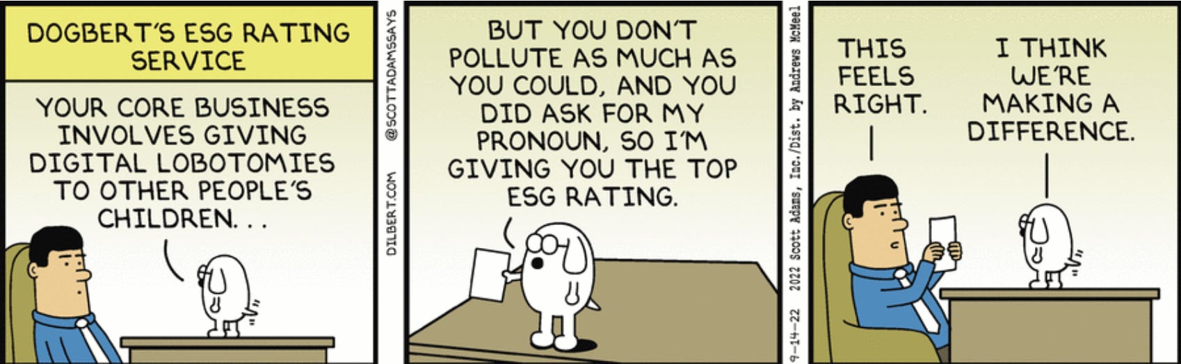 The FUNNY thing is that these more recent Scott Adams Cartoons (Scott being the creator of Dilbert) that are all about ESG and the woke business culture that has taken over the corporate world are some of the funnier Dilbert’s that I have seen in a while.