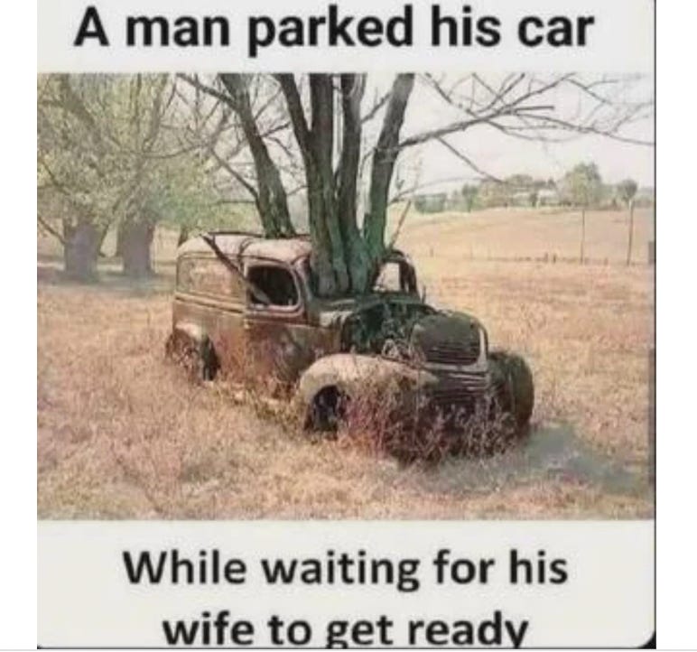 Regarding waiting for the wife: If my husband and I arrive late to an event, you can be absolutely sure it is my husband's fault, not mine. True story.