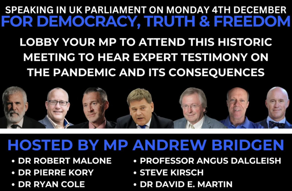 This week, we are off to London, to speak in Parliament with MP Andrew Bridgen, David Martin, Dr. Ryan Cole, Steve Kirsch, Prof. Angus Dalgleish and Dr. Pierre Kory. All MPs and Lords have been invited and @ABridgen is hosting it.
