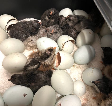 Well, starting a couple of days ago -those eggs started to hatch and hatch and hatch. There is a total of 36 chicks so far. These chicks are all a breed called Whiting True Blue, which lays a blue egg and are prolific layers - so finding homes for the extra chicks should not be a problem. Another chore on the list though. But baby chickens are the best.