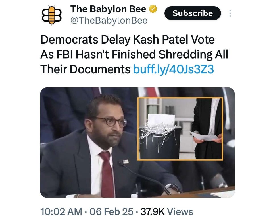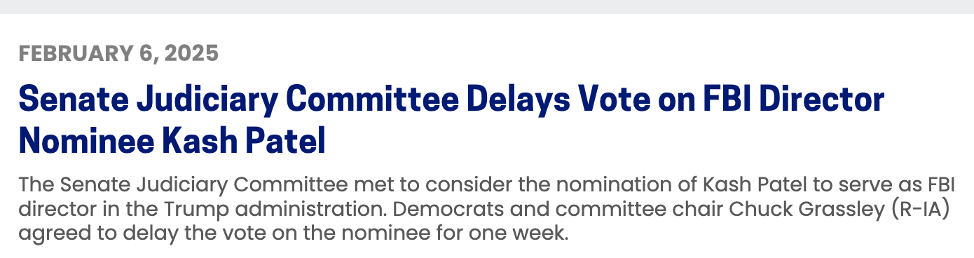 FYI: The Republicans did not agree to delay the vote on Kash Patel's nomination for FBI Director. Instead, the Democrats used a procedural rule within the Senate Judiciary Committee to force a one-week delay. This delay was not a result of Republican agreement, but rather a strategic move by the Democrats utilizing existing committee regulations.