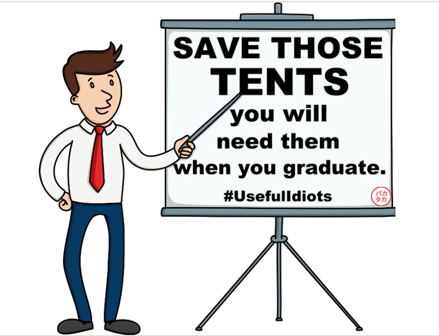 Friday Funnies is also right on the mark. "Save those tents" to start it off = perfect. I hope it comes true for a lot of those students. I think job recruiters and interviewers will be taking a hard look at the graduates from all these colleges.