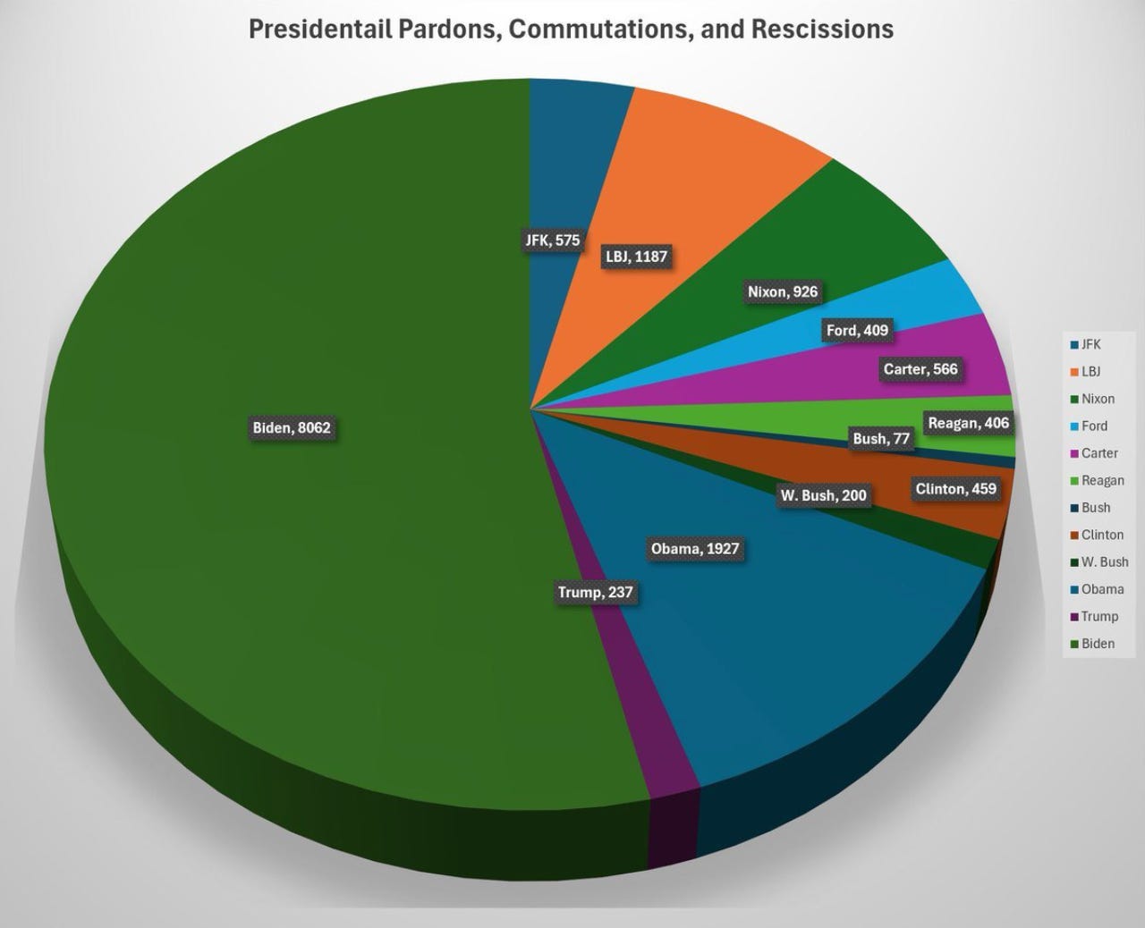 Presidential pardons, roughly 12,000 vs 2,000 implies outrageous corruption embedded in the Democratic Party, the bulk of which lies with Obama/Biden admins. DJT has a mandate to drain the swamp. The Kenyan should be first on the list.
