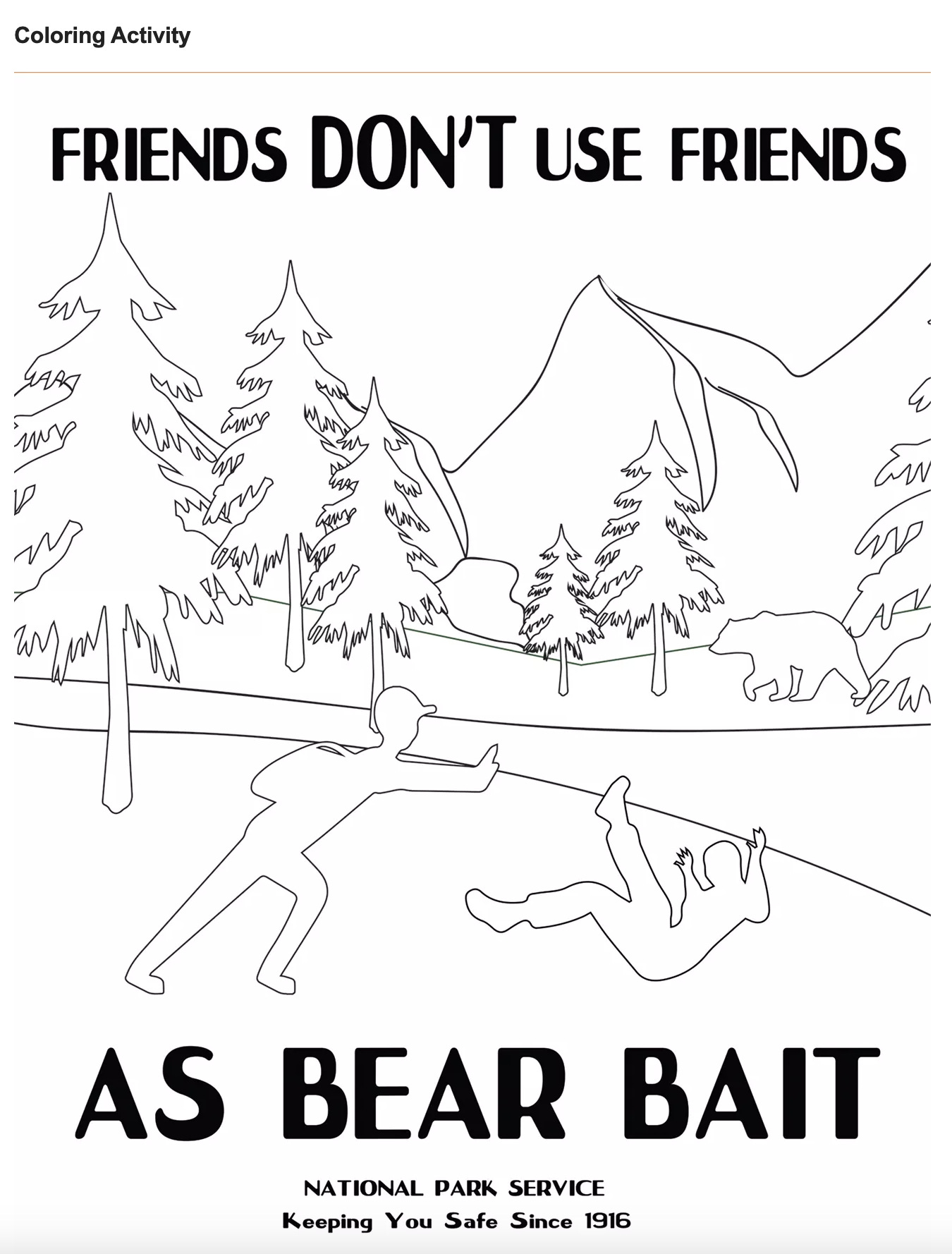 Is the meaning of this coloring activity on the National Park Service website that children need to learn to not push or throw other people in front of bears?