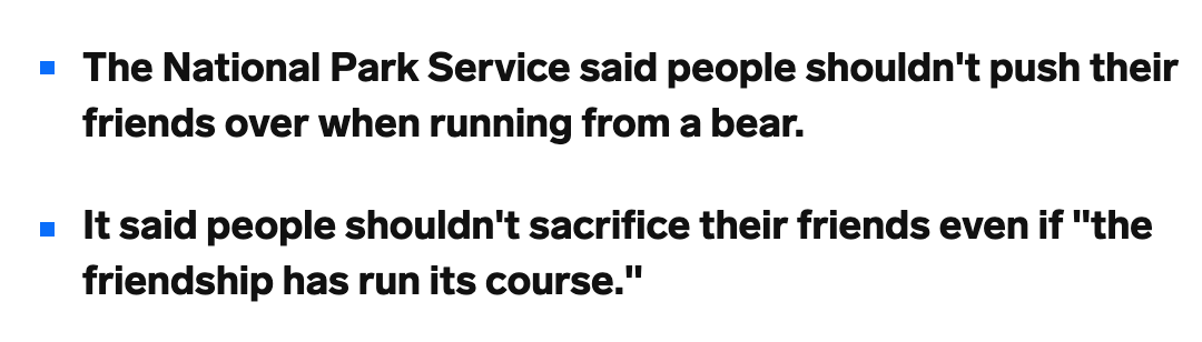 So… I find this bizarre news article today about how friends don’t push friends in the path of bears to escape an attack. I am like - WTF? Can this be possibly real? Is this the Babylon Bee at it again? You can find this story on CBS, CNN, FOX and more. Yet, not a single news organization questions why the Federal Government, in all its wisdom is spending tax payer dollars promoting this advice?