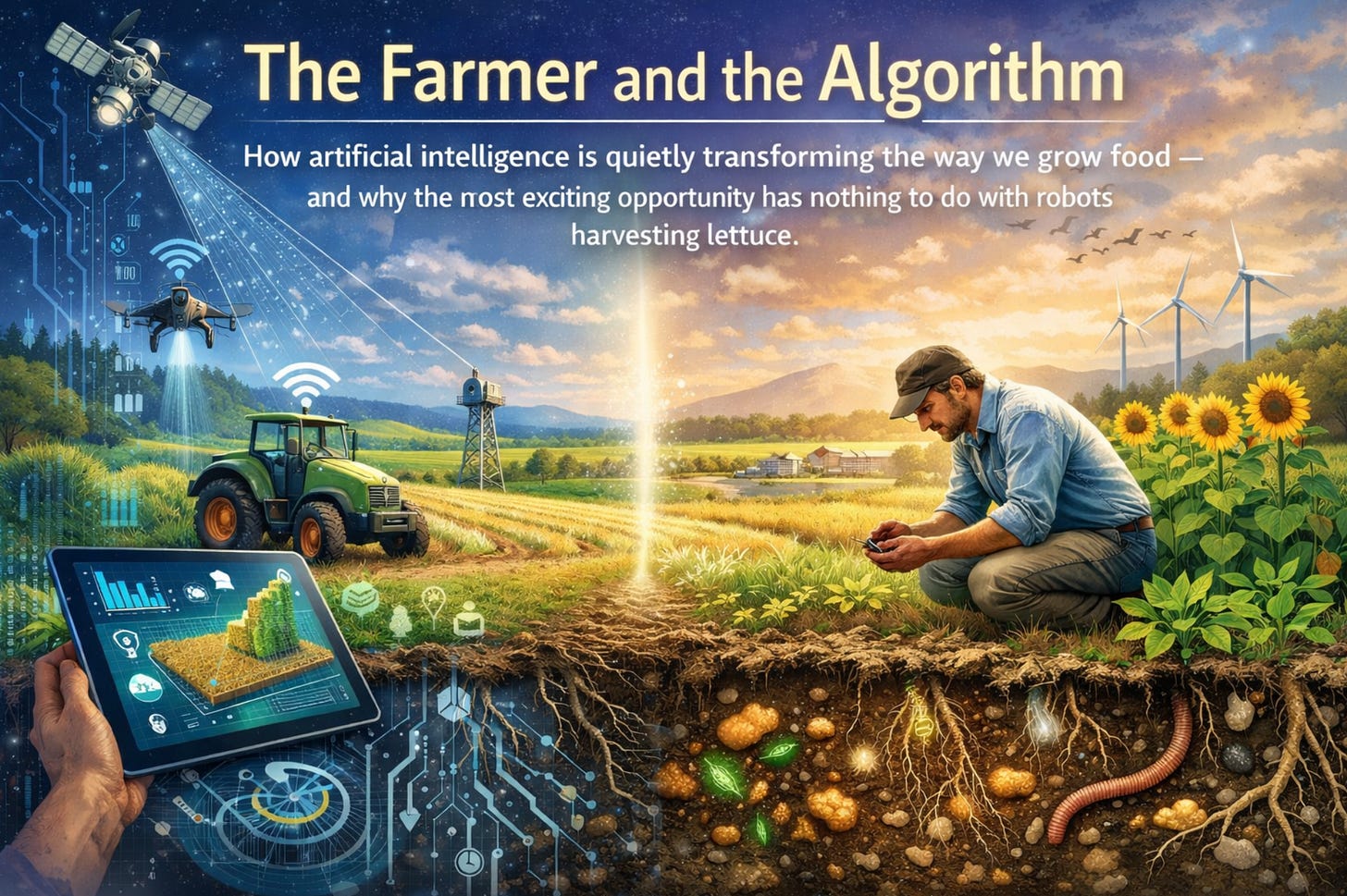 How artificial intelligence is quietly transforming the way we grow food — and why the most exciting opportunity has nothing to do with robots harvesting lettuce.