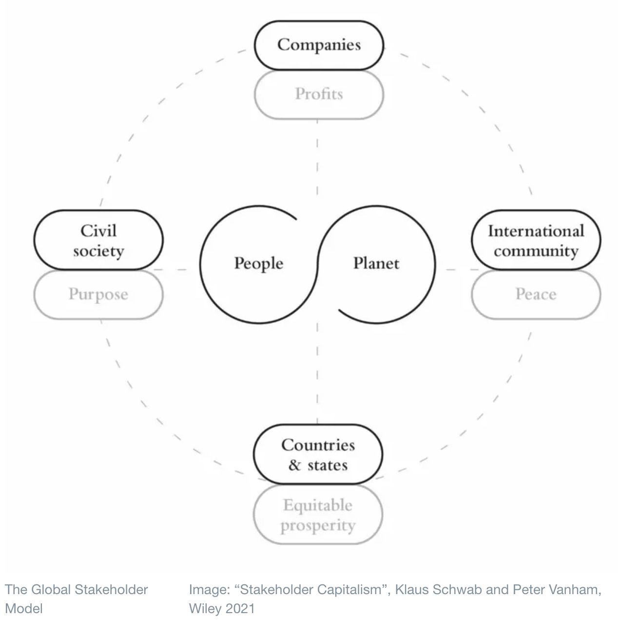 The World Economic Forum currently advocates an updated stakeholder capitalism model. The WEF proposes that under this model, governments should focus on creating the greatest possible prosperity for the greatest number of people. Civil society exists to advance its constituents' interests and give meaning or purpose to its members. Companies aim to generate an economic surplus, measurable in profits in the short run, and long-term value creation in the long run, and the overarching goal for the international community is to preserve peace. The WEF posits that, under this model, when the well-being of people and planet are at the center of business, the four remaining key groups of stakeholders contribute to their betterment, as all of these groups and their goals are interconnected.