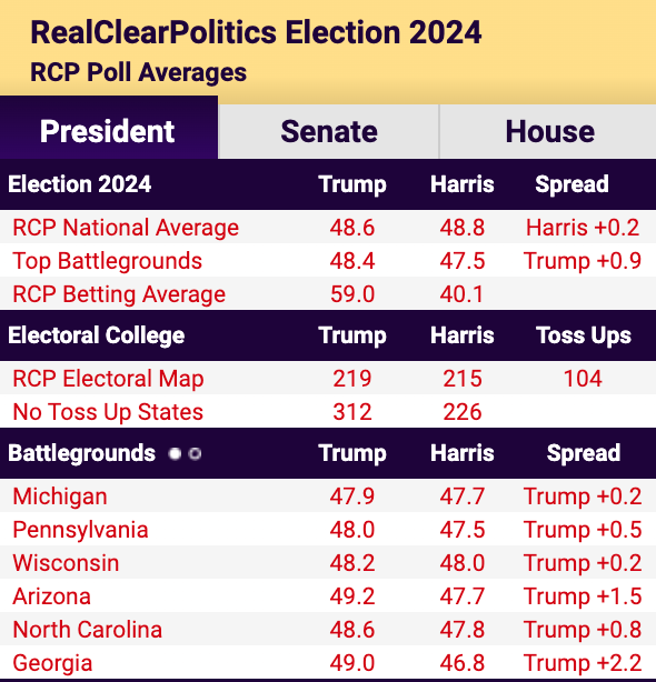 Real Clear politics - shows the continuing trend of a Trump landslide (remember that polling underestimated Trump’s support by the people to a significant degree in both 2016 and 2020).