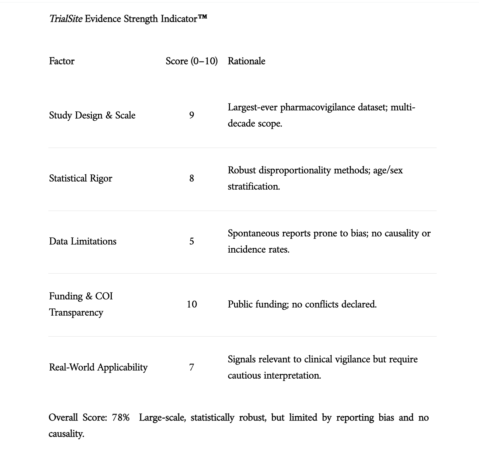 The dataset depends on spontaneous reporting, vulnerable to underreporting, overreporting, and diagnostic uncertainty. Media attention heightened clinical vigilance, and massive vaccine rollout campaigns may have amplified report volumes — a phenomenon known as stimulated reporting. No incidence rates can be derived, and causality cannot be confirmed by these associations alone.