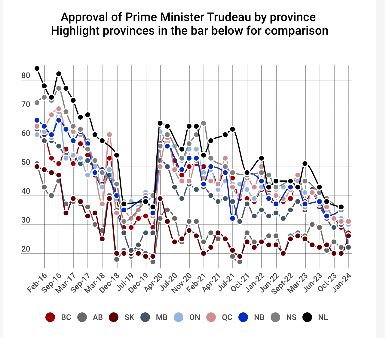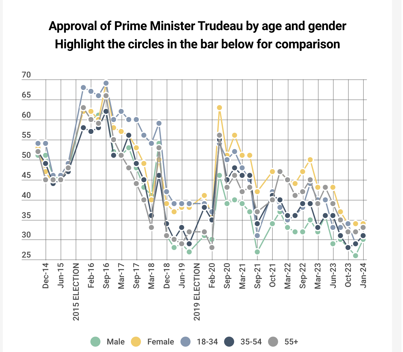 More Canadian news: Trudeau continues to tank in the polls across all genders and age cohorts and across all Canadian provinces.
