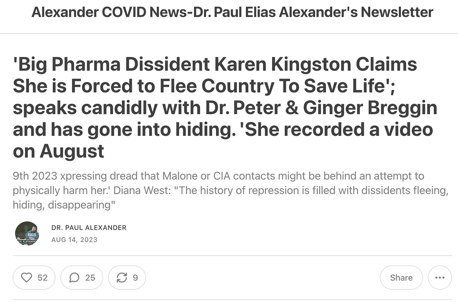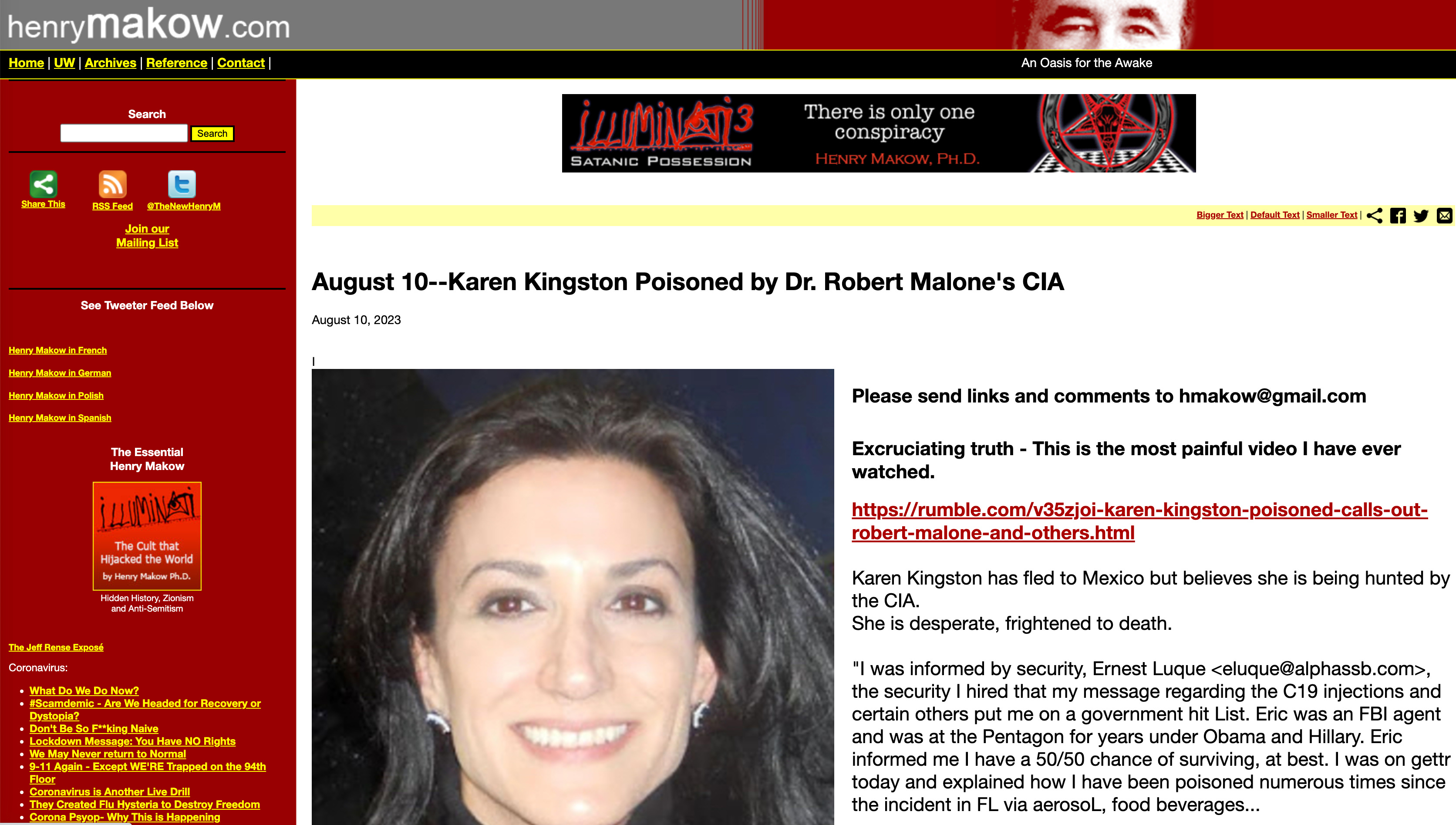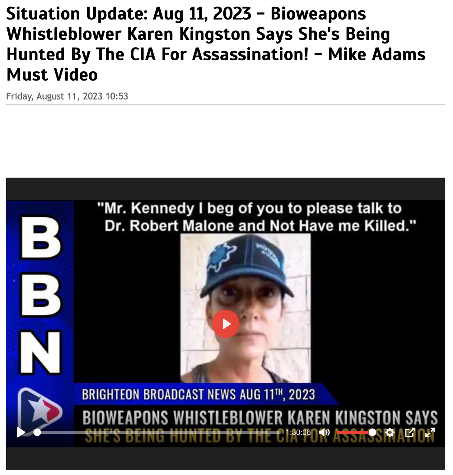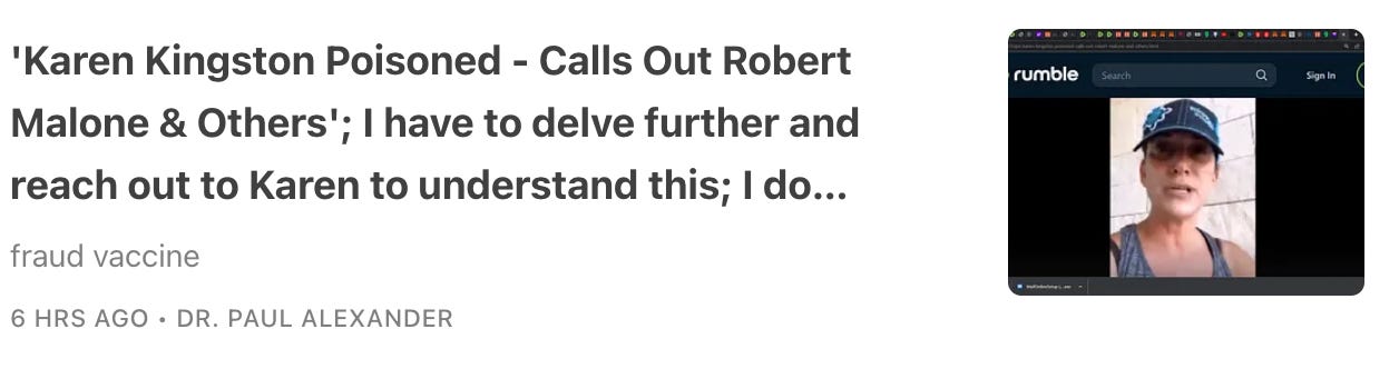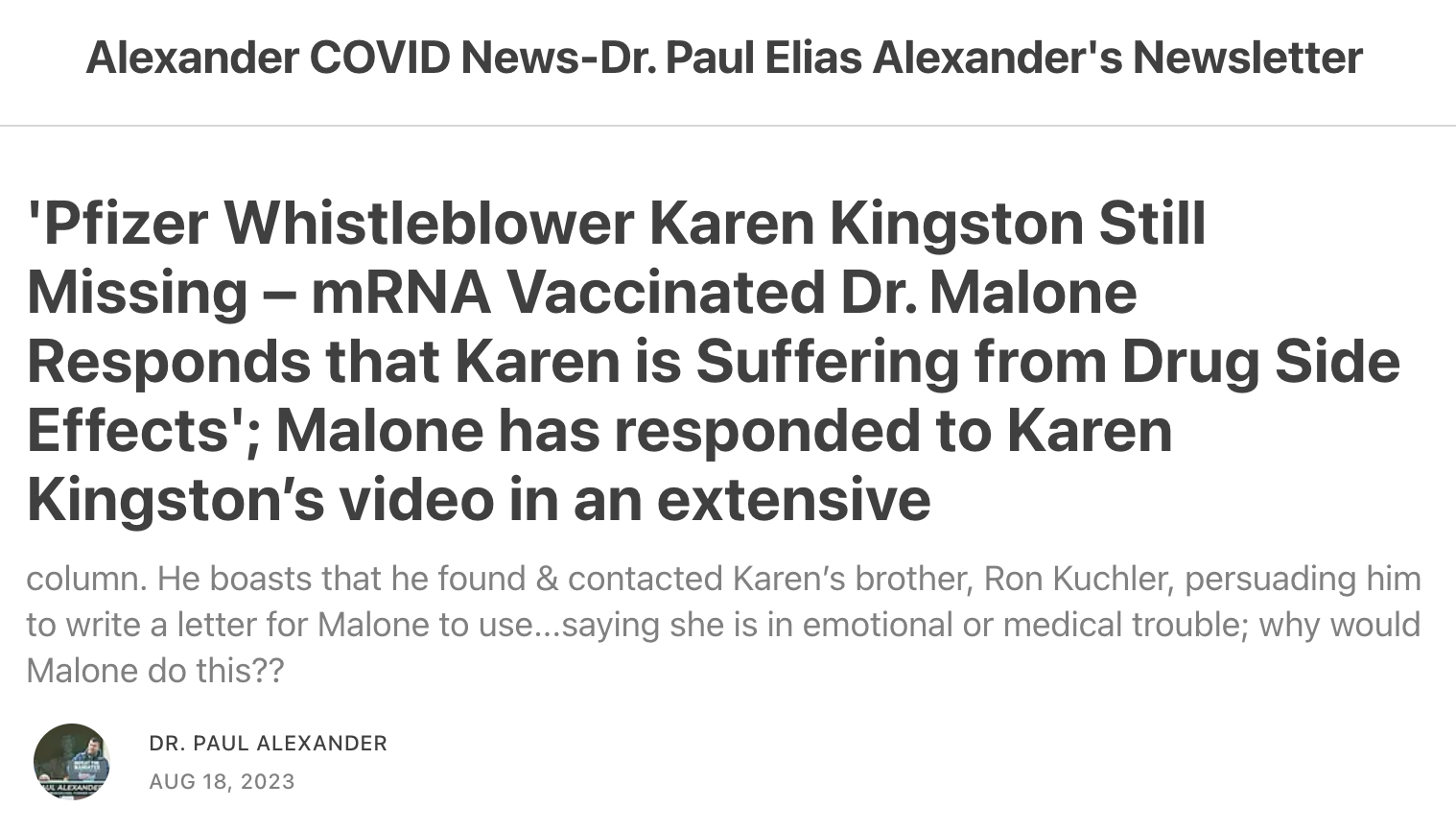 The reason that I believe she was fed the misinformation rather than making it up in a state of delusional schizophrenia is that the misinformation itself is extremely on point for the agenda of the deep state and Big Pharma. It maligns and casts suspicion on two of the most effective voices against the plandemic agenda, not to mention making Karen look crazy. So it kills three birds with one stone.