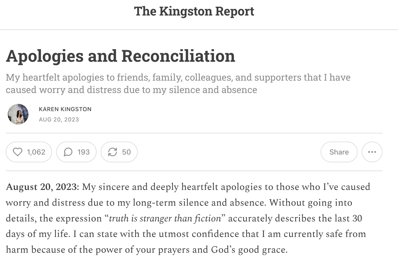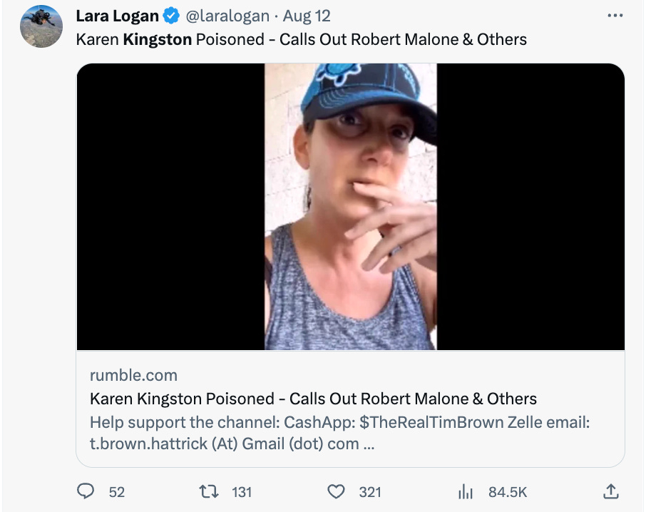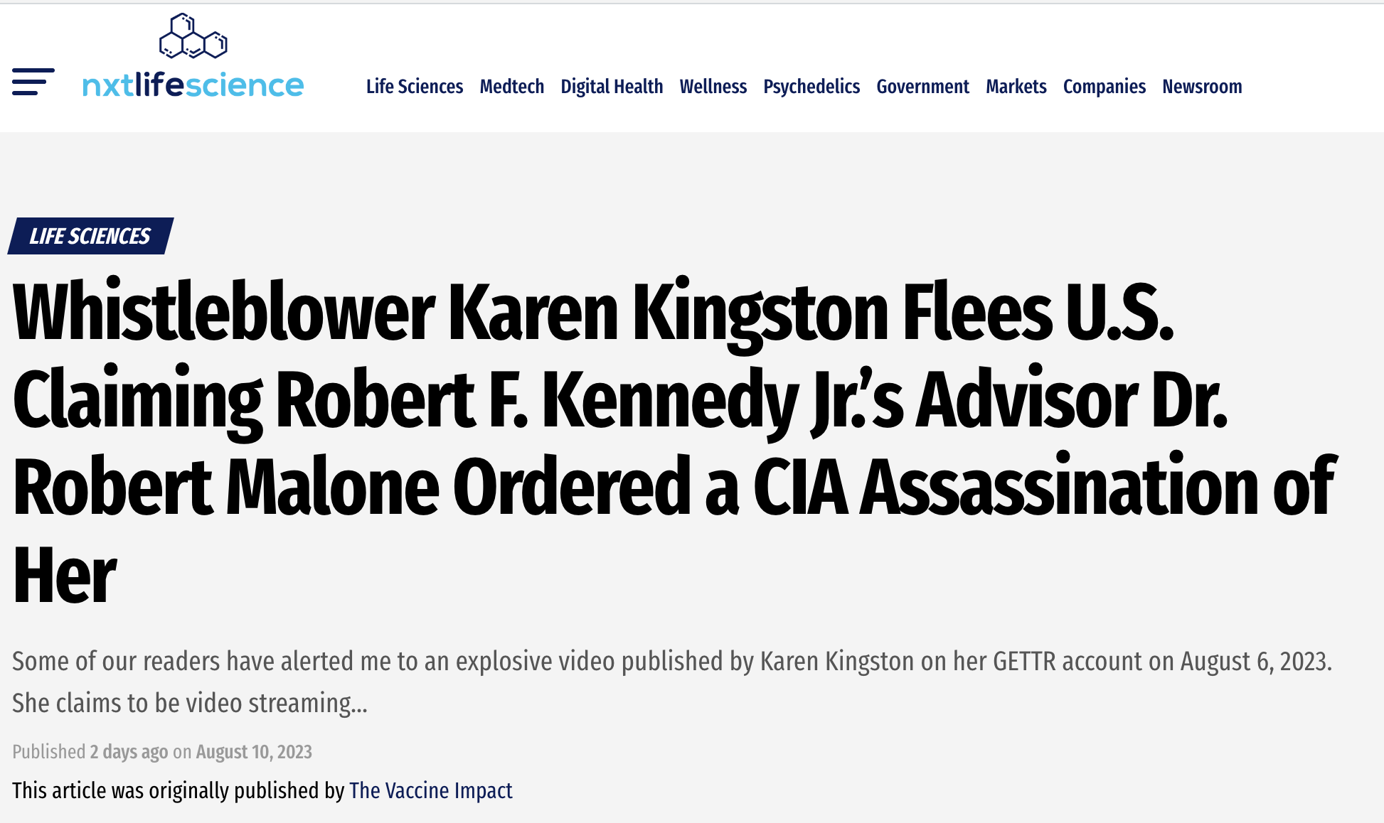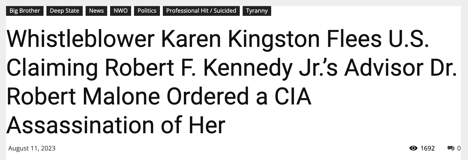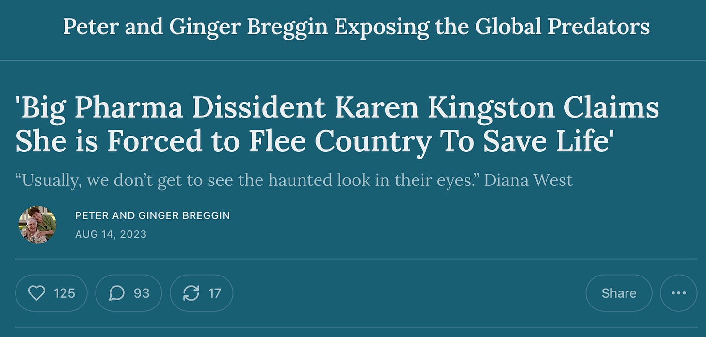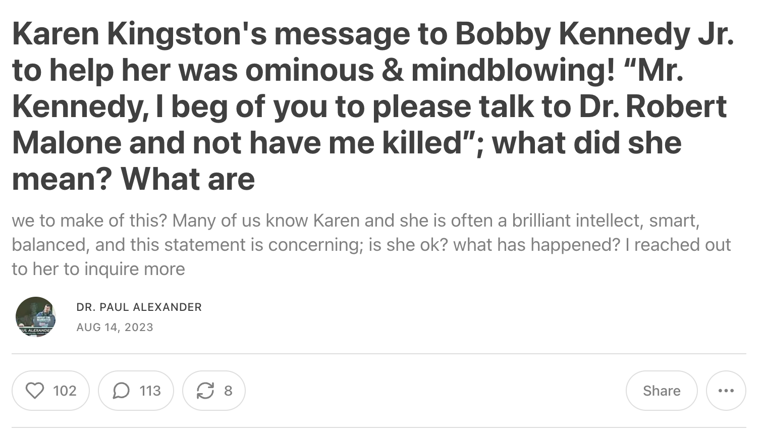 The reason that I believe she was fed the misinformation rather than making it up in a state of delusional schizophrenia is that the misinformation itself is extremely on point for the agenda of the deep state and Big Pharma. It maligns and casts suspicion on two of the most effective voices against the plandemic agenda, not to mention making Karen look crazy. So it kills three birds with one stone.