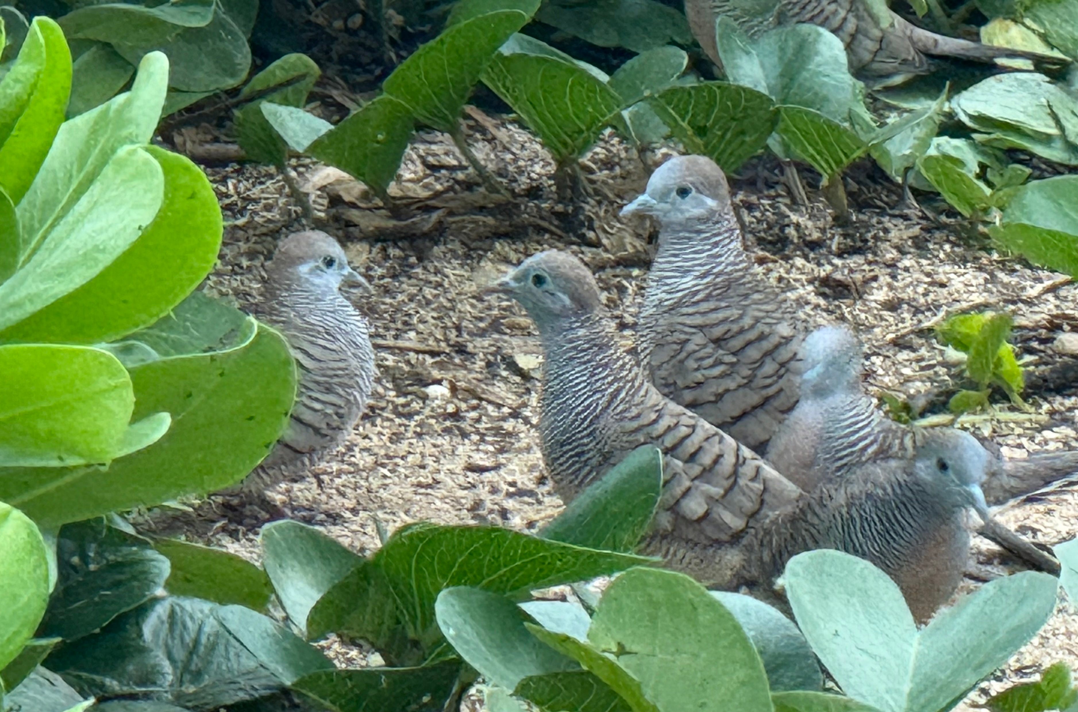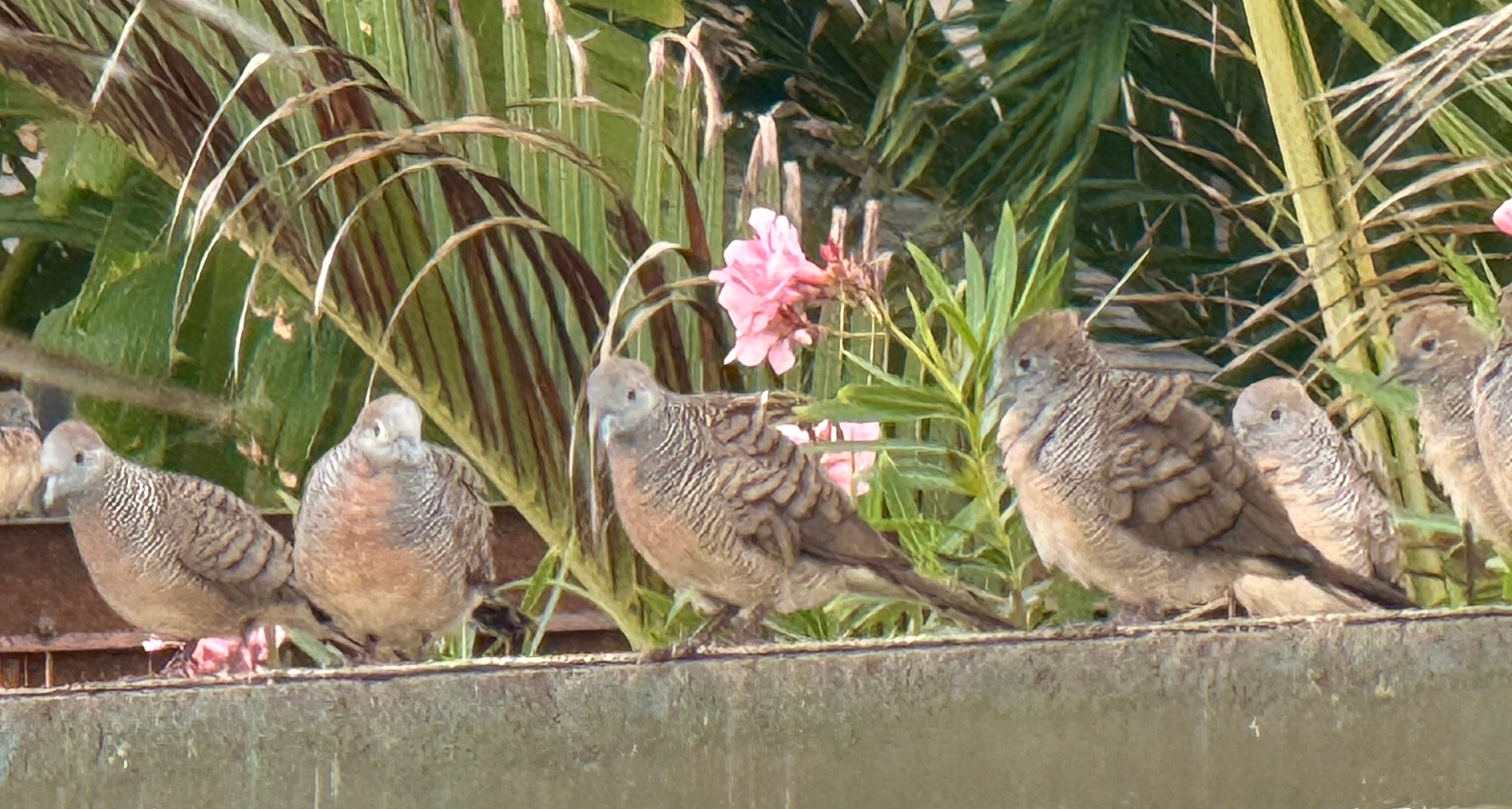 While the sparrows gobbled up the seeds, about ten little zebra doves waited patiently on the roof. At first, we thought they were waiting for the sparrows to finish feeding, as they are a rather bossy lot. Here they are, lined up on the roof - waiting for breakfast: