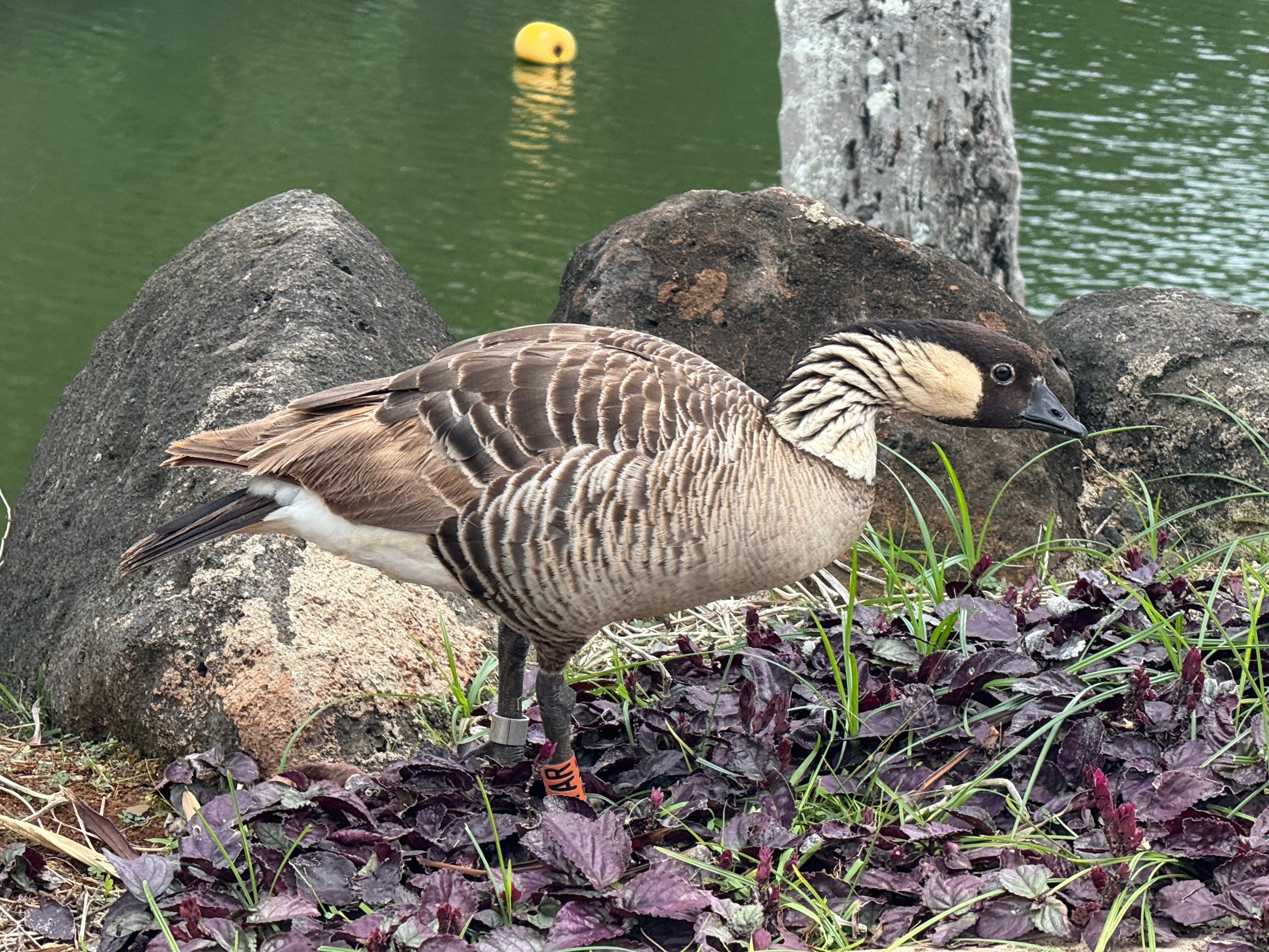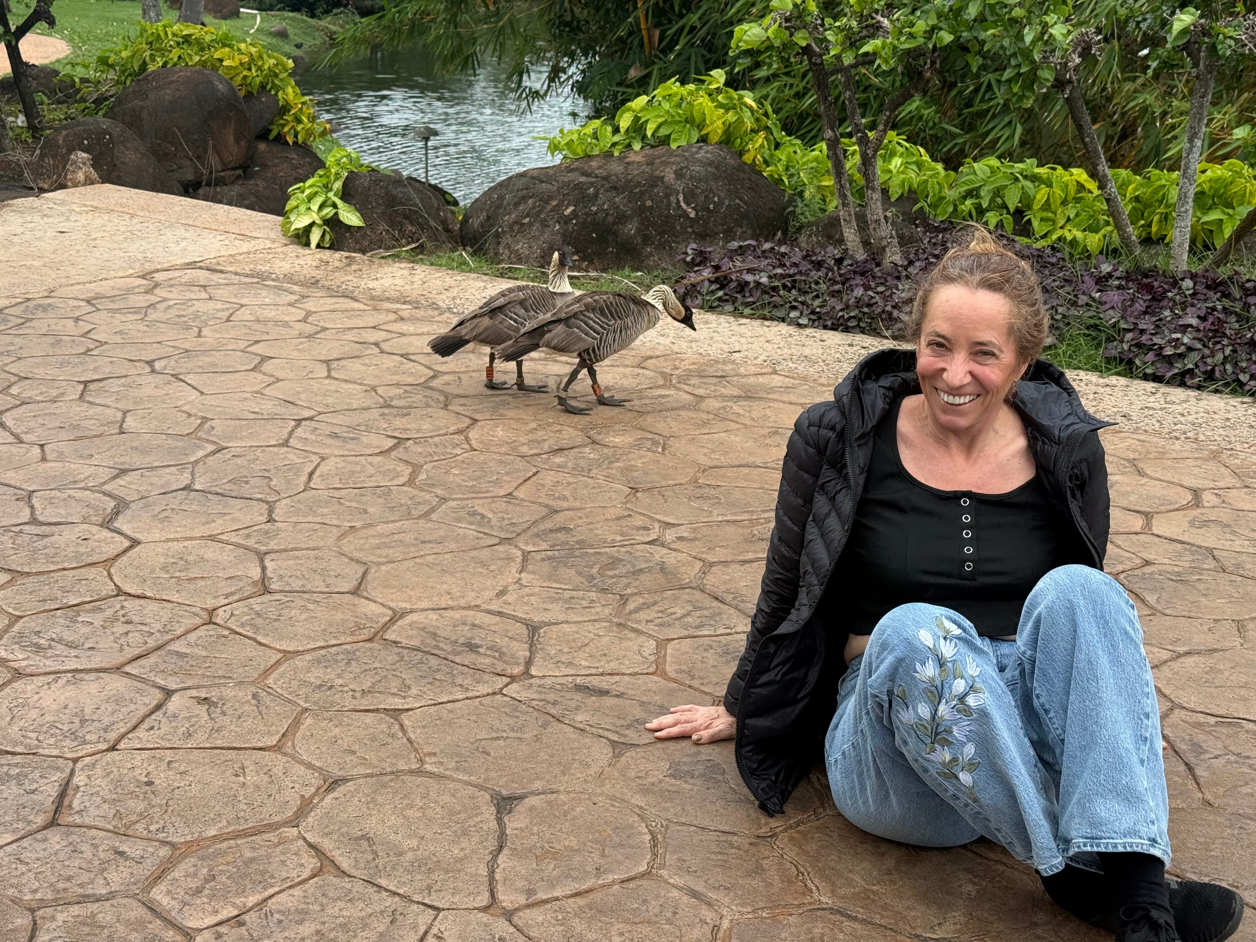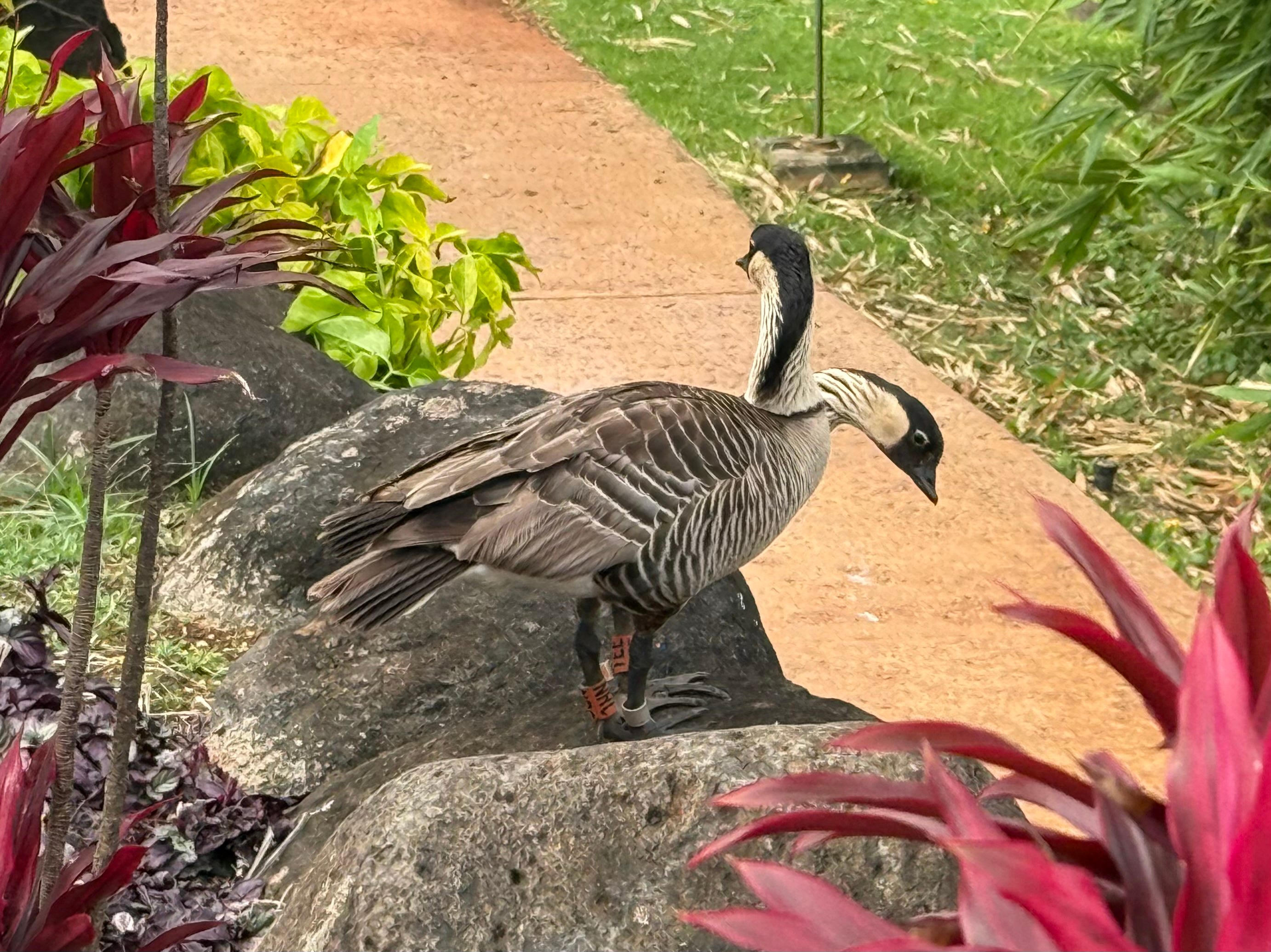 In the meantime, we were checking into Lihue Kauai Beach Resort, where Jill was enchanted by the native Nene geese at the entrance. These small native geese are the state bird, and although supposedly endangered, have made a huge comeback and are all over the island