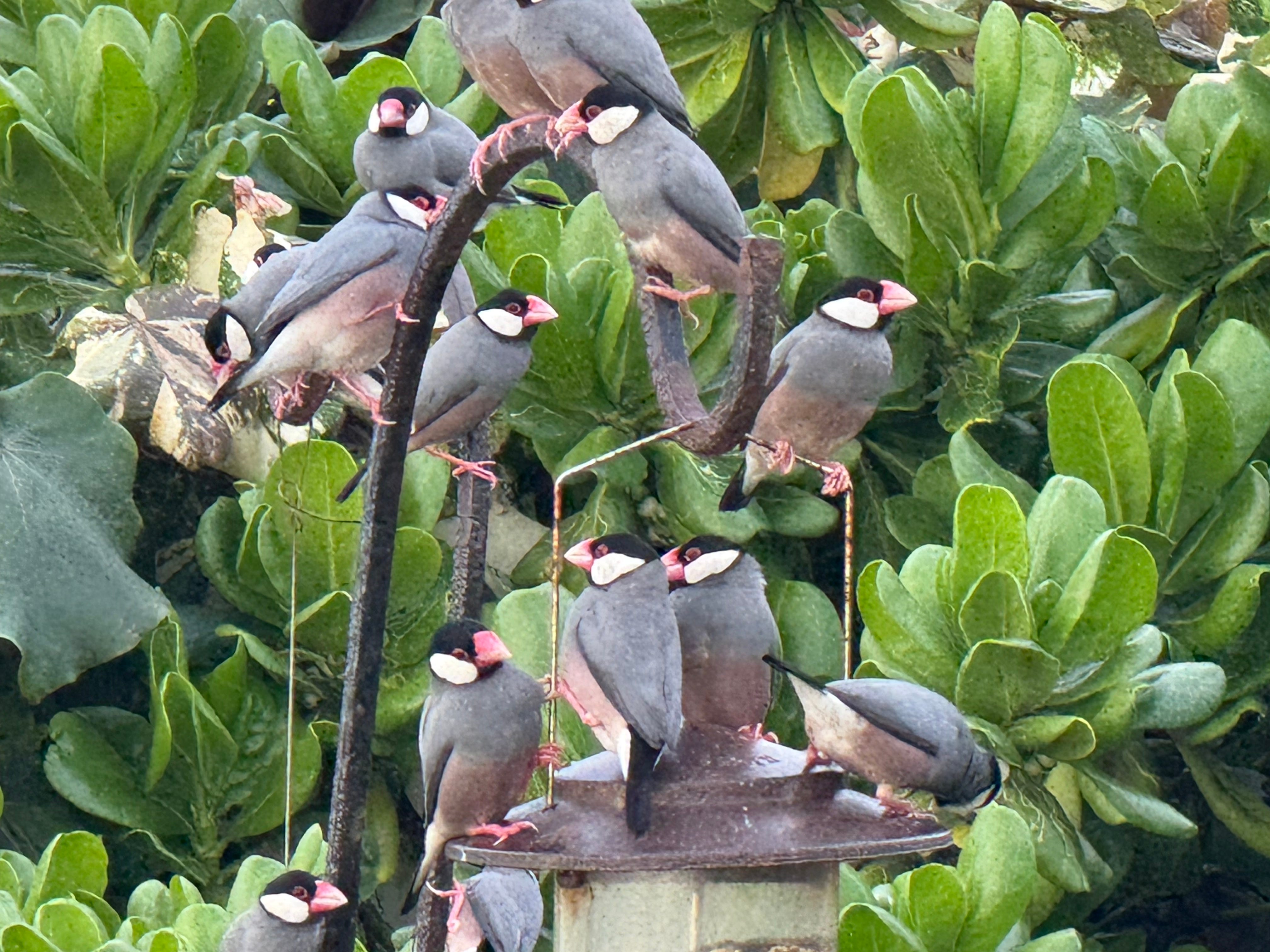 The cottage owner refilled the bird feeders while I was on the phone, and then the Java sparrows arrived. These birds are lively and colorful, confident, with little fear of humans, and they are quite garrulous. Jill took a short video.