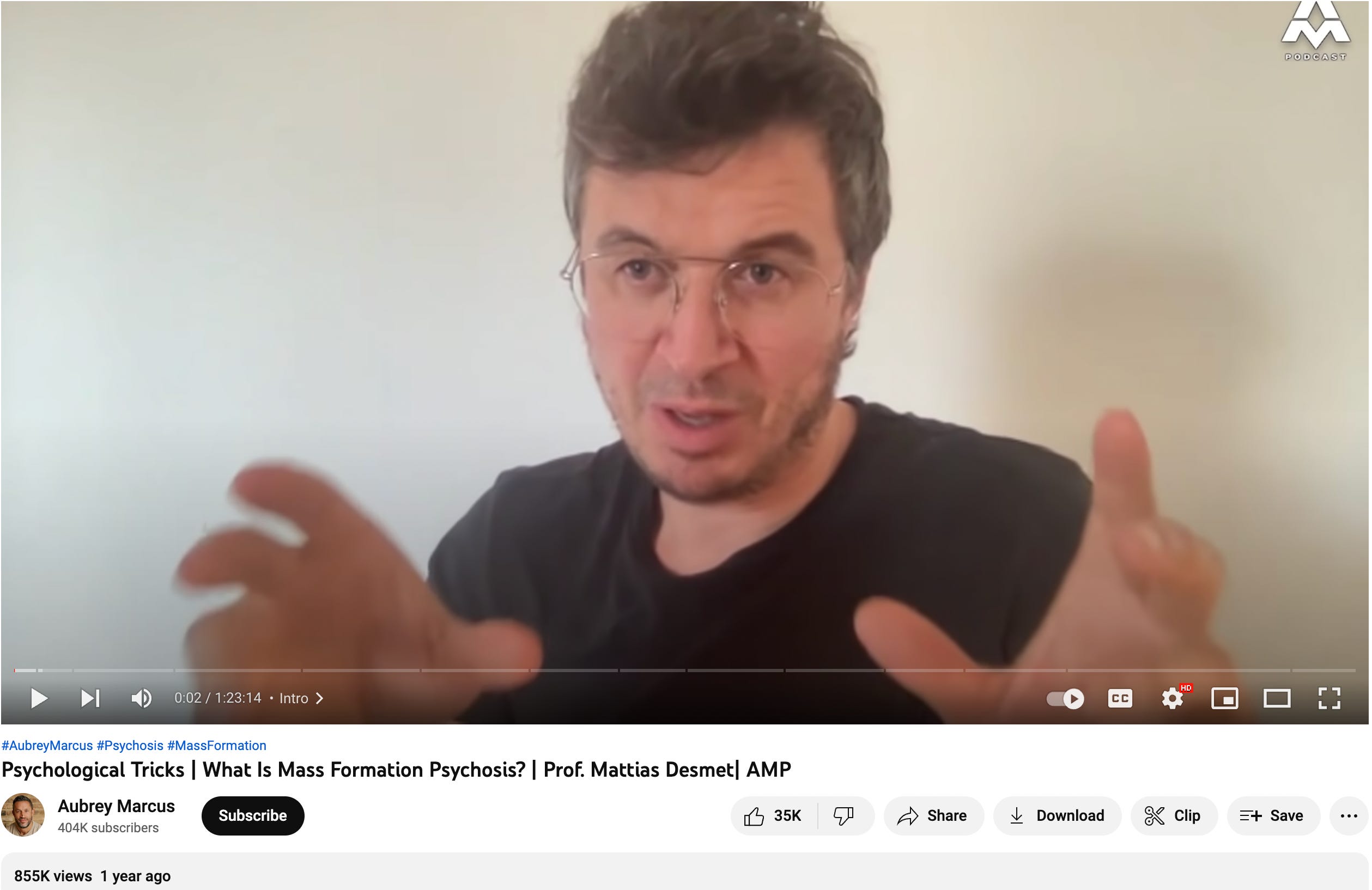 Over a year ago, I was at a rally in a Florida megachurch, slated to speak following Dr. Peter McCullough. As he often does, Peter provided a comprehensive assessment of the latest data and publications regarding early treatment and vaccine harms. As I approached the stage, I faced the problem of what I could speak on that had not already just been covered by Peter. And so I decided to speak on this new theory that I was learning about, and had first encountered as “Mass Formation Psychosis” in the Aubrey Marcus podcast linked above. I had not prepared any text, had no slides, and I just began speaking. And as I spoke of this theory, I was stunned by the look of relief on the faces in the audience. Grown men with tears streaming down.