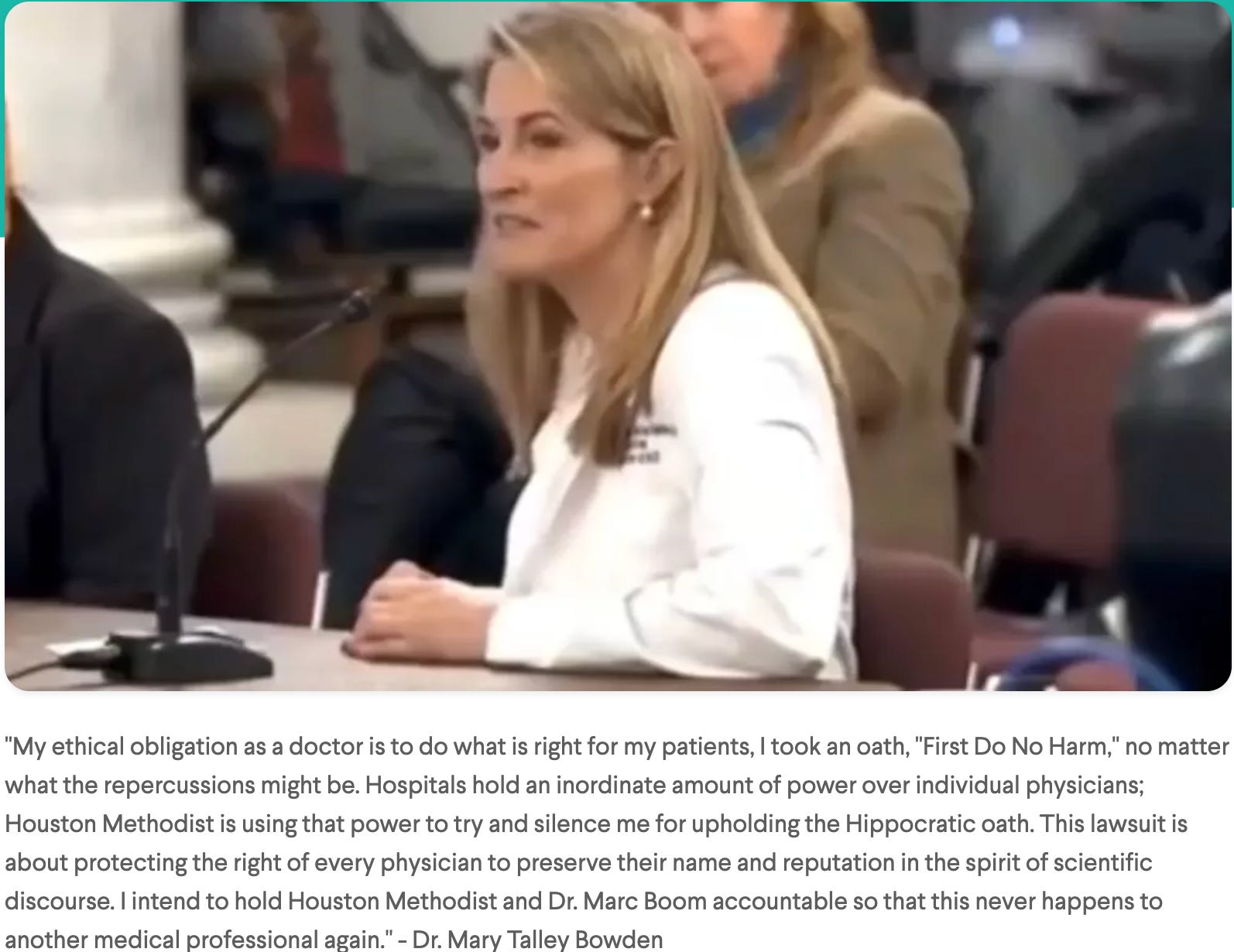 On November 12 2021, one of the largest non-profit hospitals in Houston with over $13 billion in assets suspended my privileges for spreading ‘dangerous misinformation.’ Days prior, I had released a series of 25 tweets all stating the same thing - “Vaccine mandates are wrong” - with a screenshot of different patient testimonials. Houston Methodist retaliated by declaring on Twitter I was spreading “dangerous misinformation” that was “harmful to the community.” I learned of my suspension through a text message from a reporter at the Houston Chronicle and spent the following months fielding interview requests from a swarm of media.