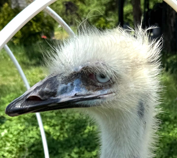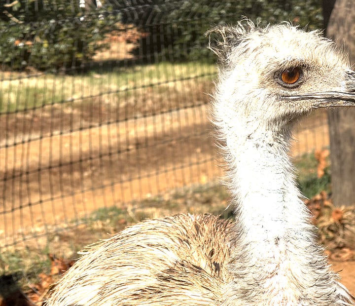 So, as most of you know - Gizmo the emu has spent two years doing walk-abouts around the farm with her best friend, Gonzo (a?) the goose. Then, a few months ago, Gizmo decided it was time to find love in all the wrong places, and began doing walkabouts off the farm. One night, she just didn’t come home until the next morning, sending Jill off searching for her at twilight - no luck, and then Jill worried all night long. About dawn the next morning, Gizmo appeared outside our bedroom window.