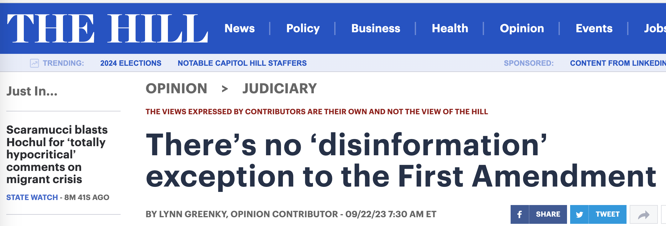 The title of the article, “There’s no “disinformation” exception to the First Amendment” is strong. That is…what we all want to hear - censorship is bad!