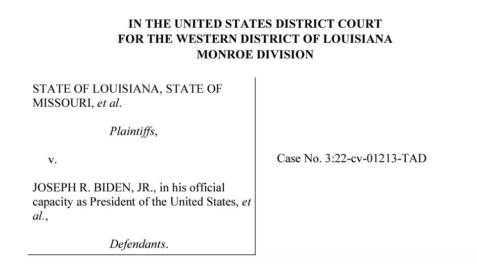 Another big hint that this article is not what it seems is that the title of the court case is “Missouri v. Biden”. Yet, somehow the article does not mention President Biden’s name once. Not once. Instead, this is as close as it gets to naming the plaintiffs: “The White House, the CDC, the FBI and the surgeon general". Note the sleight of hand. This is the name of the case. Biden’s name is listed first on most case documents - yet the article, which has been distributed to the likes of “Real Clear Politics” and other big news aggregators, manages to not use Biden’s name once in the entire essay!